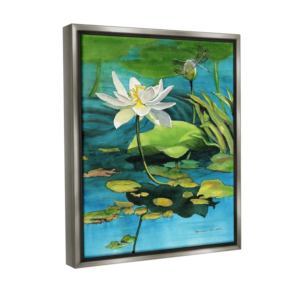 Elevate your home or office to the next level with Stupell Framed Floating Canvas Wall Art. Our premium hand-stretched canvas is mounted securely into a sturdy lightweight frame. The museum-style gap between the wrapped canvas and the box frame gives the illusion of floating artwork. Stupell Wall Art is made in the USA.Features: Dimensions: 17 x 1.7 x 21 Frame, 16 x 1.5 x 20 Canvas ArtFloating Frame Canvas Products are available in sizes 17"x21" and 25"x31". All Floating Frame Canvas Products have a 1.7" Depth.Wall Art is Ready to Hang with Hardware Free Hanging. No Installation required. For Easy Set Up Lean or Layer Artwork on Shelf or Against Wall. Artwork is Permently Fixed into the Frame.Our elevated 1.7" Thick Floating Frame is the perfect complement to our canvas style Wall Art. We use only the highest quality inks in house with industry leading printing solutions. Canvas is hand stretched over a durable wood foundation and then mounted securly into a Modern Box Frame. Made in the USA.Artwork Relates To: Flower, Plant, Lily, Pond Lily, Nature, Pond, Water, Petal, Lotus, Dragonfly, Lily PadDesign by Christine Reichow