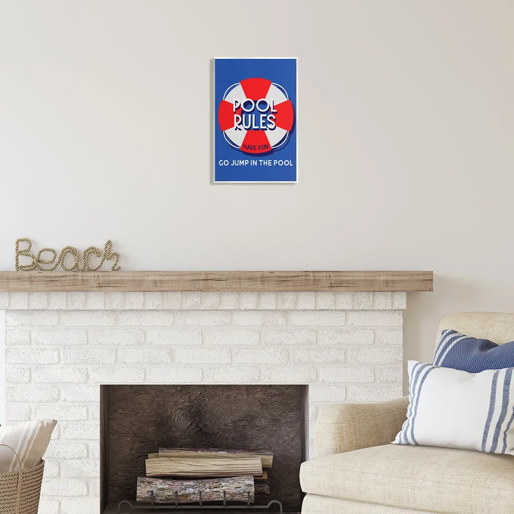 Our wall plaques start as high-quality lithograph prints mounted on durable 0.5-inch thick MDF wood. Each piece is hand finished and comes with a fresh layer of white foil on the sides to give it a crisp, clean look. Plaques arrive ready to hang without installation and come with removable plastic corners to keep them from damage in transit. Wall Art is made in the USA.Features: Dimensions: 10 x 0.5 x 15 InchesWall Plaque Sizes Include Standard: 10 x 0.5 x 15 Oversized: 13 x 0.5 x 19Wall Art is Ready to Hang with Hardware Free Hanging. No installation required. For Easy Set Up Lean or Layer Artwork on Shelf or Against Wall.All of our wall plaques start off as high quality lithograph prints that are then mounted on durable 0.5 inch thick MDF wood. Each piece is hand finished and comes with a fresh layer of foil on the sides to give it a crisp clean look. Made In USA.Artwork Relates To: Life Ring, Nautical, Marine, Ocean, Sea, Pool Rules, Have Fun, Go Jump in the PoolDesign by Lil' Rue