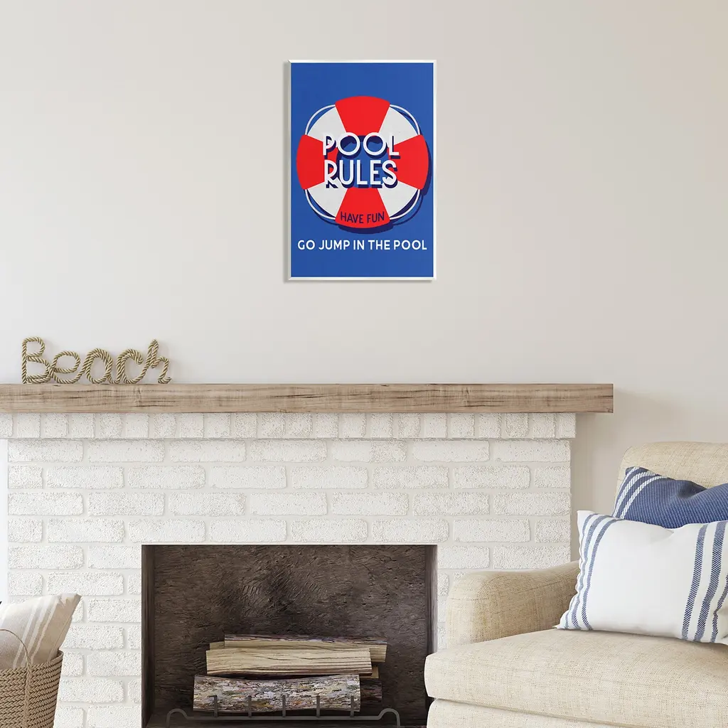 Our wall plaques start as high-quality lithograph prints mounted on durable 0.5-inch thick MDF wood. Each piece is hand finished and comes with a fresh layer of white foil on the sides to give it a crisp, clean look. Plaques arrive ready to hang without installation and come with removable plastic corners to keep them from damage in transit. Wall Art is made in the USA.Features: Dimensions: 10 x 0.5 x 15 InchesWall Plaque Sizes Include Standard: 10 x 0.5 x 15 Oversized: 13 x 0.5 x 19Wall Art is Ready to Hang with Hardware Free Hanging. No installation required. For Easy Set Up Lean or Layer Artwork on Shelf or Against Wall.All of our wall plaques start off as high quality lithograph prints that are then mounted on durable 0.5 inch thick MDF wood. Each piece is hand finished and comes with a fresh layer of foil on the sides to give it a crisp clean look. Made In USA.Artwork Relates To: Life Ring, Nautical, Marine, Ocean, Sea, Pool Rules, Have Fun, Go Jump in the PoolDesign by Lil' Rue