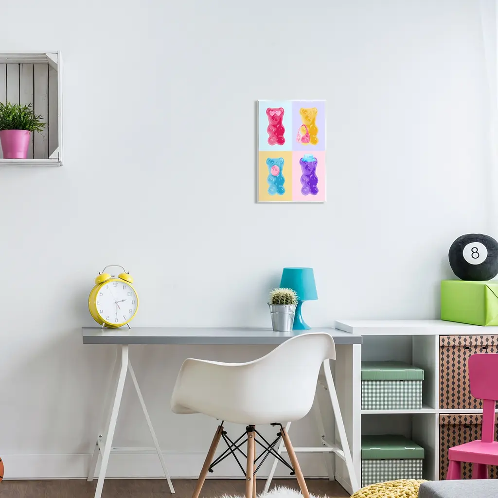 Our wall plaques start as high-quality lithograph prints mounted on durable 0.5-inch thick MDF wood. Each piece is hand finished and comes with a fresh layer of white foil on the sides to give it a crisp, clean look. Plaques arrive ready to hang without installation and come with removable plastic corners to keep them from damage in transit. Stupell Wall Art is made in the USA.Features: Dimensions: 10 x 0.5 x 15 InchesWall Plaque Sizes Include Standard: 10 x 0.5 x 15 Oversized: 13 x 0.5 x 19Wall Art is Ready to Hang with Hardware Free Hanging. No installation required. For Easy Set Up Lean or Layer Artwork on Shelf or Against Wall.All of our wall plaques start off as high quality lithograph prints that are then mounted on durable 0.5 inch thick MDF wood. Each piece is hand finished and comes with a fresh layer of foil on the sides to give it a crisp clean look. Made In USA.Artwork Relates To: Food, Candy, Modern, Gummy, Bear, Pop StyleDesign by Daphne Polselli
