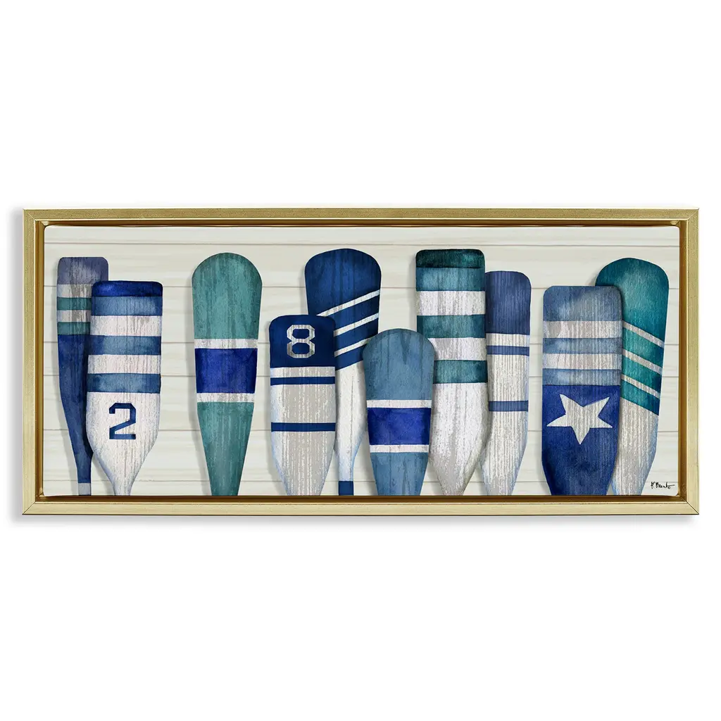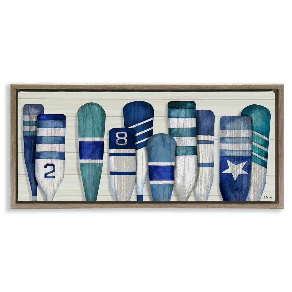 Elevate your home or office to the next level with Stupell Framed Floating Canvas Wall Art. Our premium hand-stretched canvas is mounted securely into a sturdy lightweight frame. The museum-style gap between the wrapped canvas and the box frame gives the illusion of floating artwork. Stupell Wall Art is made in the USA.Features: Dimensions: 25 x 1.7 x 11 Frame, 24 x 1.5 x 10 Canvas ArtFloating Frame Canvas Products are available in sizes 25"x11" and 31"x14". All Floating Frame Canvas Products have a 1.7" Depth.Wall Art is Ready to Hang with Hardware Free Hanging. No Installation required. For Easy Set Up Lean or Layer Artwork on Shelf or Against Wall. Artwork is Permently Fixed into the Frame.Our elevated 1.7" Thick Floating Frame is the perfect complement to our canvas style Wall Art. We use only the highest quality inks in house with industry leading printing solutions. Canvas is hand stretched over a durable wood foundation and then mounted securly into a Modern Box Frame. Made in the USA.Artwork Relates To: Oars, Paddle, Boating, Stripes, Pattern, Lake, Rustic, NauticalDesign by Paul Brent
