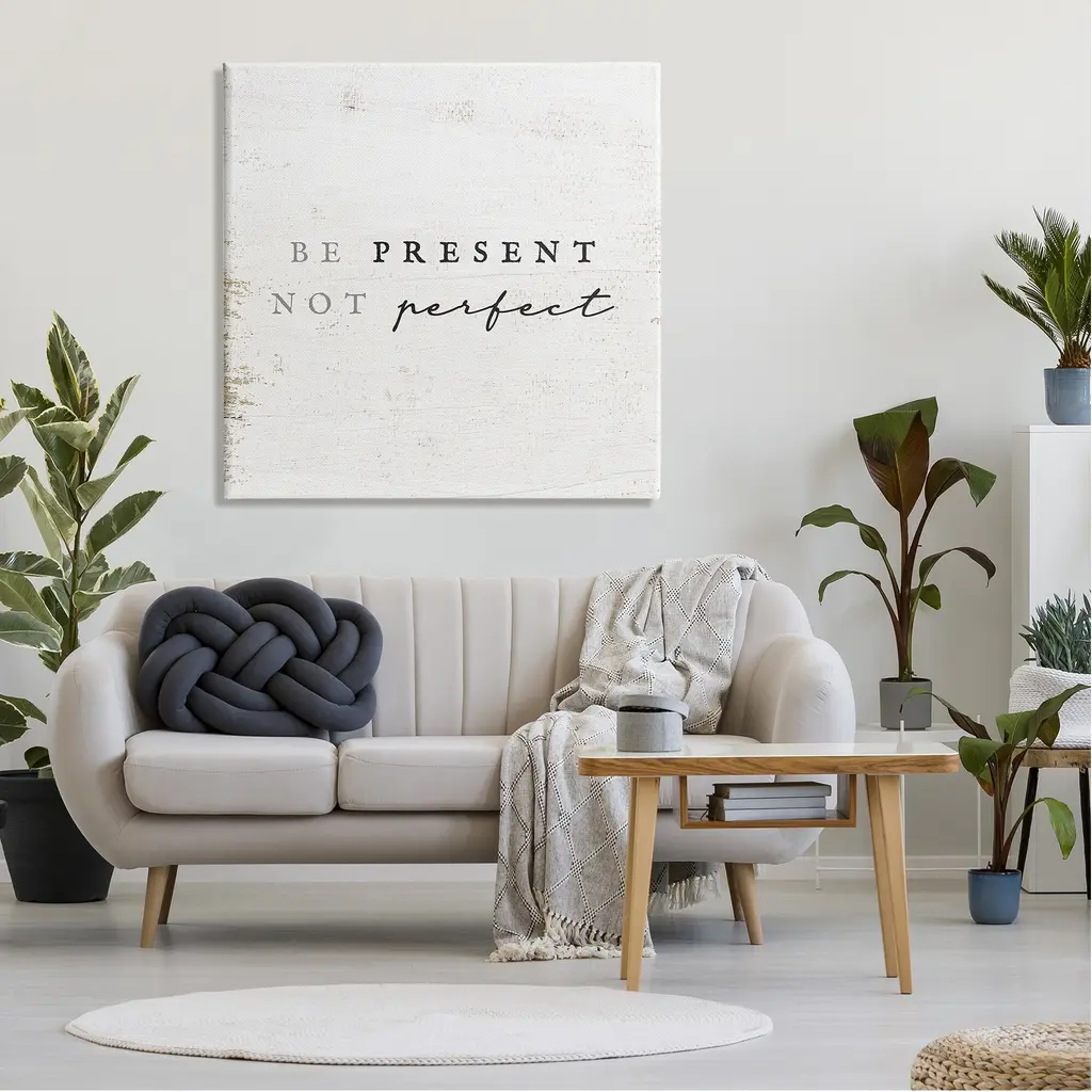 We create our stretched canvas to the highest standards. Using only the highest quality inks and canvas on Mimaki printers, we hand-cut and stretch each piece over a 1.5-inch thick wooden frame for hanging. As a result, the art comes ready to hang on the sturdy ledge with no installation required. Stupell Wall Art is made in the USA.Features: Dimensions: 17 x 1.5 x 17 InchesStretched Canvas Sizes Include Standard: 17 x 1.5 x 17 Large: 24 x 1.5 x 24 X-Large: 30 x 1.5 x 30 Oversized: 36 x 1.5 x 36Wall Art is Ready to Hang with Hardware Free Hanging. No installation required. For Easy Set Up Lean or Layer Artwork on Shelf or Against Wall.Our stretched canvas is created with the highest standards. We use only the highest quality inks and canvas on our in house Mimaki printers, and then hand cut and stretch each piece over a 1.5 inch thick wooden frame for hanging. Made In USA.Artwork Relates To: Phrase, Rustic, Be Present Not PerfectDesign by Lil' Rue