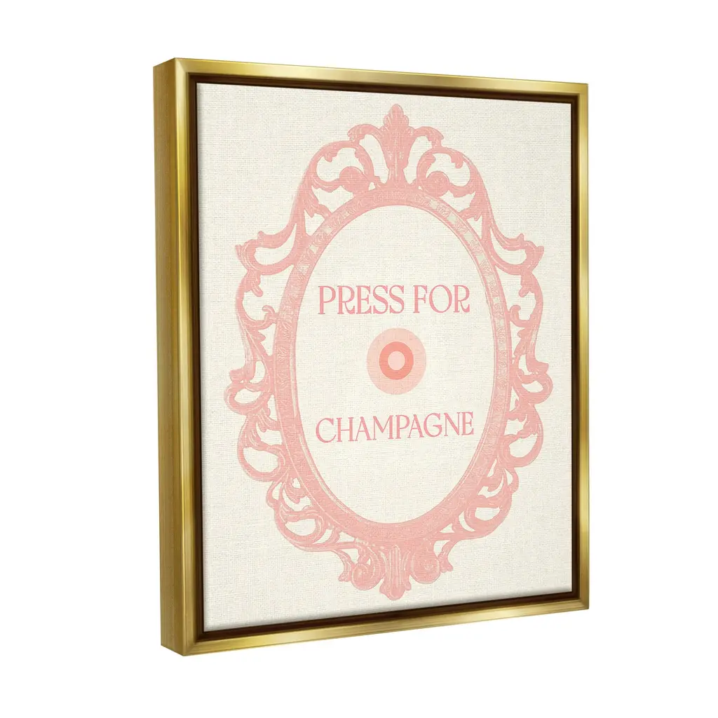 Elevate your home or office to the next level with Stupell Framed Floating Canvas Wall Art. Our premium hand-stretched canvas is mounted securely into a sturdy lightweight frame. The museum-style gap between the wrapped canvas and the box frame gives the illusion of floating artwork. Stupell Wall Art is made in the USA.Features: Dimensions: 17 x 1.7 x 21 Frame, 16 x 1.5 x 20 Canvas ArtFloating Frame Canvas Products are available in sizes 17"x21" and 25"x31". All Floating Frame Canvas Products have a 1.7" Depth.Wall Art is Ready to Hang with Hardware Free Hanging. No Installation required. For Easy Set Up Lean or Layer Artwork on Shelf or Against Wall. Artwork is Permently Fixed into the Frame.Our elevated 1.7" Thick Floating Frame is the perfect complement to our canvas style Wall Art. We use only the highest quality inks in house with industry leading printing solutions. Canvas is hand stretched over a durable wood foundation and then mounted securly into a Modern Box Frame. Made in the USA.Artwork Relates To: Glam, Fashion, Champagne, Liquor, Alcohol, Wine, Vintage, Pattern, Press For ChampagneDesign by Lil' Rue
