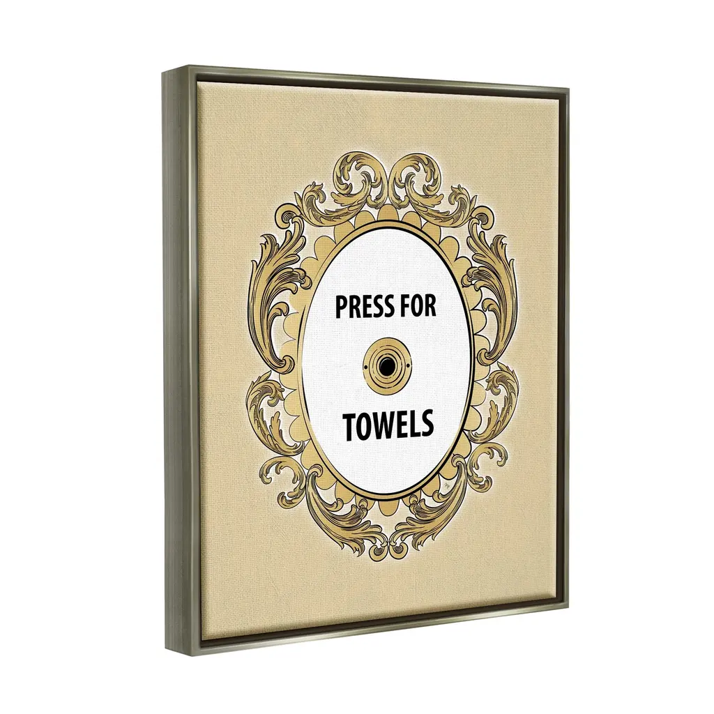 Elevate your home or office to the next level with Stupell Framed Floating Canvas Wall Art. Our premium hand-stretched canvas is mounted securely into a sturdy lightweight frame. The museum-style gap between the wrapped canvas and the box frame gives the illusion of floating artwork. Stupell Wall Art is made in the USA.Features: Dimensions: 17 x 1.7 x 21 Frame, 16 x 1.5 x 20 Canvas ArtFloating Frame Sizes Include Standard: 17 x 1.7 x 21 Oversized: 25 x 1.7 x 31Wall Art is Ready to Hang - No Installation or Hardware Needed. For Easy Set Up Lean or Layer Artwork on Shelf or Against Wall.Our elevated 1.7" Thick Floating Frame is the perfect complement to our canvas style Wall Art. We use only the highest quality inks in house with industry leading printing solutions. Canvas is hand stretched over a durable wood foundation and then mounted securly into a Modern Box Frame. Made in the USA.Artwork Relates To: Ornate, Bell, Baroque, Bathroom, Humor, Press For TowelsDesign by Martina Pavlova