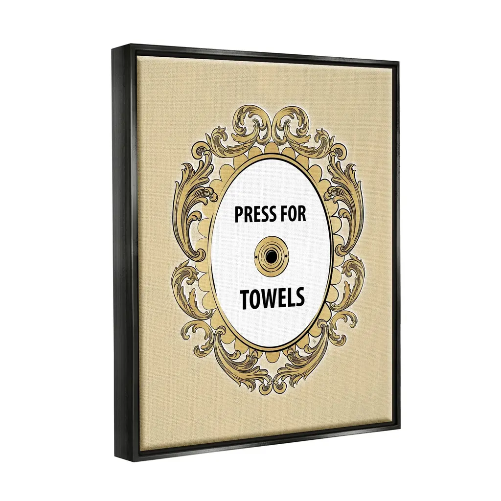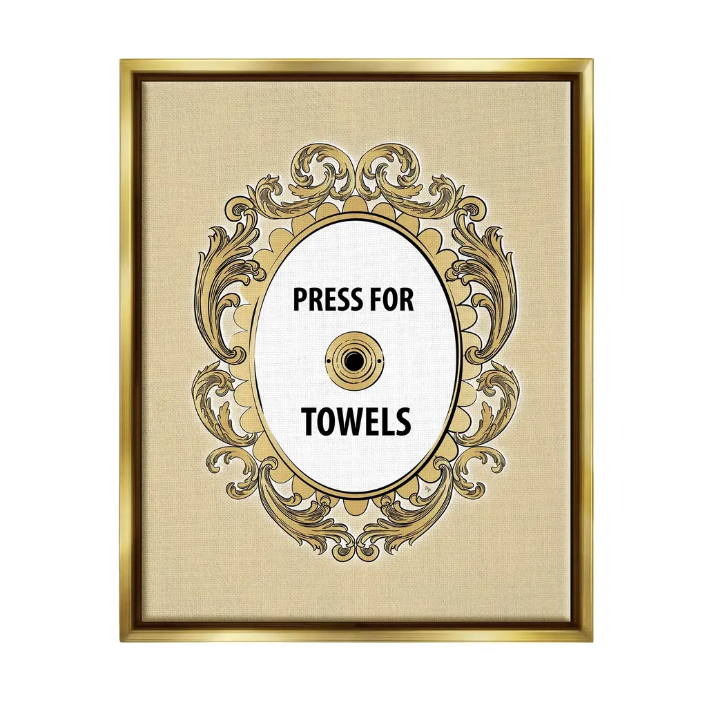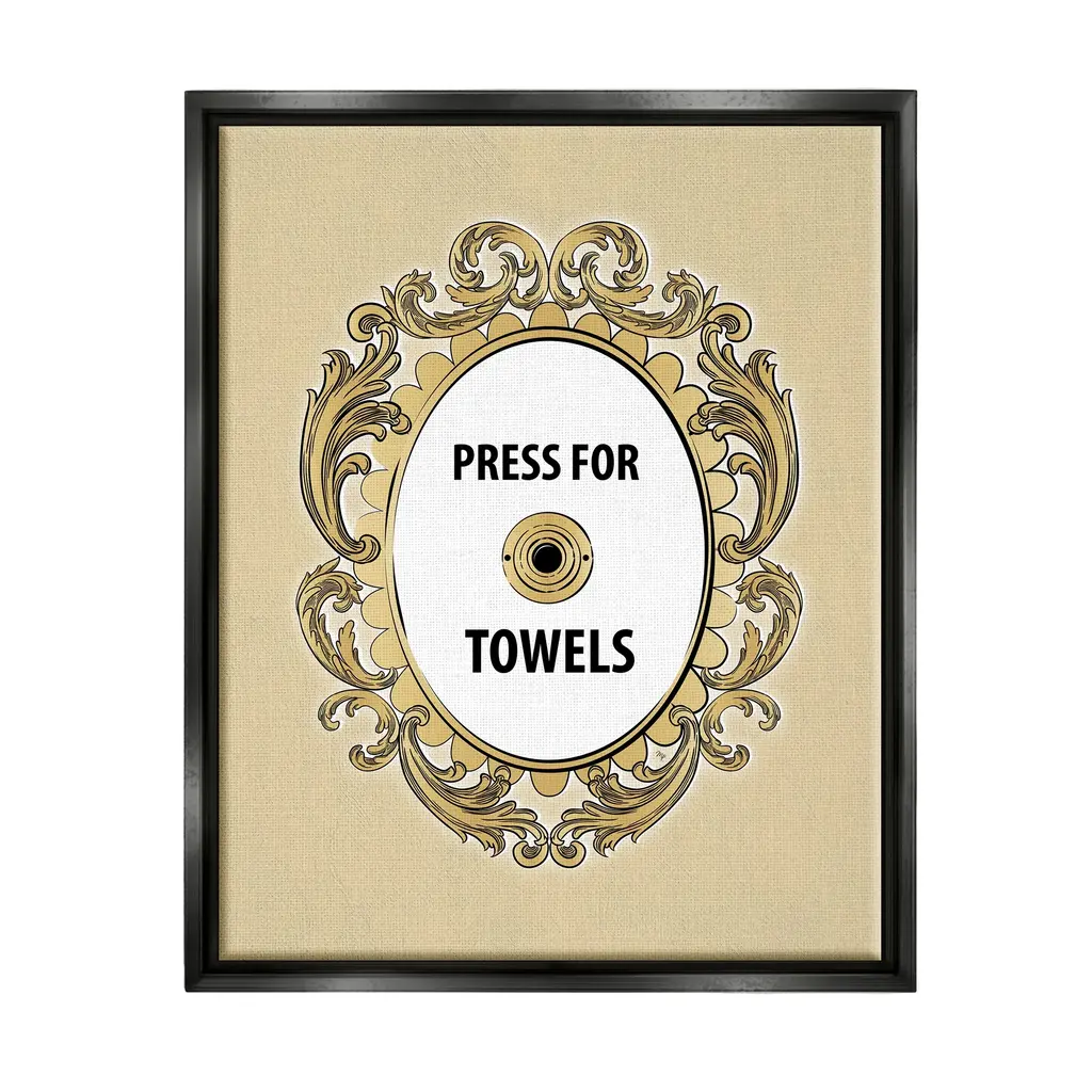 Elevate your home or office to the next level with Stupell Framed Floating Canvas Wall Art. Our premium hand-stretched canvas is mounted securely into a sturdy lightweight frame. The museum-style gap between the wrapped canvas and the box frame gives the illusion of floating artwork. Stupell Wall Art is made in the USA.Features: Dimensions: 17 x 1.7 x 21 Frame, 16 x 1.5 x 20 Canvas ArtFloating Frame Sizes Include Standard: 17 x 1.7 x 21 Oversized: 25 x 1.7 x 31Wall Art is Ready to Hang - No Installation or Hardware Needed. For Easy Set Up Lean or Layer Artwork on Shelf or Against Wall.Our elevated 1.7" Thick Floating Frame is the perfect complement to our canvas style Wall Art. We use only the highest quality inks in house with industry leading printing solutions. Canvas is hand stretched over a durable wood foundation and then mounted securly into a Modern Box Frame. Made in the USA.Artwork Relates To: Ornate, Bell, Baroque, Bathroom, Humor, Press For TowelsDesign by Martina Pavlova