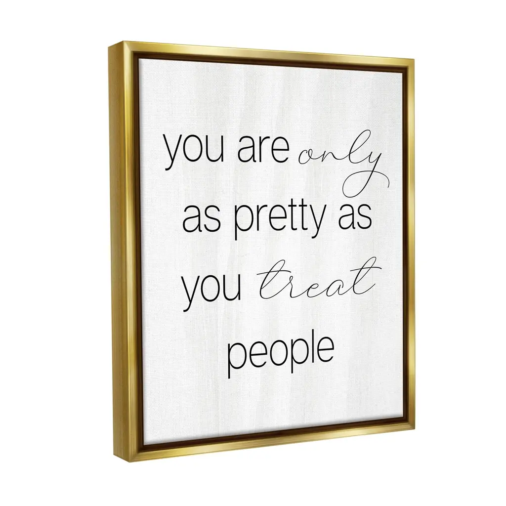 Elevate your home or office to the next level with Stupell Framed Floating Canvas Wall Art. Our premium hand-stretched canvas is mounted securely into a sturdy lightweight frame. The museum-style gap between the wrapped canvas and the box frame gives the illusion of floating artwork. Stupell Wall Art is made in the USA.Features: Dimensions: 17 x 1.7 x 21 Frame, 16 x 1.5 x 20 Canvas ArtFloating Frame Canvas Products are available in sizes 17"x21" and 25"x31". All Floating Frame Canvas Products have a 1.7" Depth.Wall Art is Ready to Hang with Hardware Free Hanging. No Installation required. For Easy Set Up Lean or Layer Artwork on Shelf or Against Wall. Artwork is Permently Fixed into the Frame.Our elevated 1.7" Thick Floating Frame is the perfect complement to our canvas style Wall Art. We use only the highest quality inks in house with industry leading printing solutions. Canvas is hand stretched over a durable wood foundation and then mounted securly into a Modern Box Frame. Made in the USA.Artwork Relates To: Phrase, Minimal, Beauty, Inspirational, Motivational, You Are Only As Pretty As You Treat PeopleDesign by Lil' Rue
