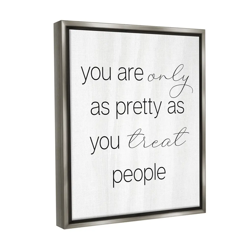 Elevate your home or office to the next level with Stupell Framed Floating Canvas Wall Art. Our premium hand-stretched canvas is mounted securely into a sturdy lightweight frame. The museum-style gap between the wrapped canvas and the box frame gives the illusion of floating artwork. Stupell Wall Art is made in the USA.Features: Dimensions: 17 x 1.7 x 21 Frame, 16 x 1.5 x 20 Canvas ArtFloating Frame Canvas Products are available in sizes 17"x21" and 25"x31". All Floating Frame Canvas Products have a 1.7" Depth.Wall Art is Ready to Hang with Hardware Free Hanging. No Installation required. For Easy Set Up Lean or Layer Artwork on Shelf or Against Wall. Artwork is Permently Fixed into the Frame.Our elevated 1.7" Thick Floating Frame is the perfect complement to our canvas style Wall Art. We use only the highest quality inks in house with industry leading printing solutions. Canvas is hand stretched over a durable wood foundation and then mounted securly into a Modern Box Frame. Made in the USA.Artwork Relates To: Phrase, Minimal, Beauty, Inspirational, Motivational, You Are Only As Pretty As You Treat PeopleDesign by Lil' Rue