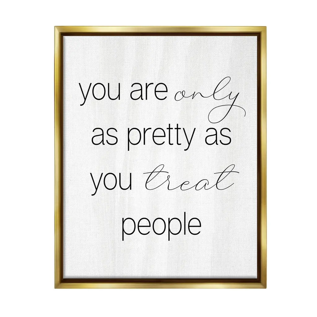 Add dimension to any room with our textured Framed Giclee Artwork. Our framed artwork is securely mounted into a 1.5-inch thick wood grain frame and ready to hang. Frames are available in three alluring styles: black, gray farmhouse and white. In addition, you should check out our oversized options if you want a statement piece. Stupell Wall Art is made in the USA.Features: Dimensions: 11 x 1.5 x 14 FramedFramed Giclee Products are available in the sizes 11"x14", 16"x20" or 24"x30". All Framed Giclee Products have a 1.5" Depth. Wall Art is Ready to Hang with Hardware Free Hanging. No installation required. For Easy Set Up Lean or Layer Artwork on Shelf or Against Wall.Our giclée prints are carefully mounted on a durable MDF backing, and then perfectly finished in a 1.5 inch thick woodgrain frame. Mounted frame colors include black, gray farmhouse and white. Made In USA.Artwork Relates To: Phrase, Minimal, Beauty, Inspirational, Motivational, You Are Only As Pretty As You Treat PeopleDesign by Lil' Rue