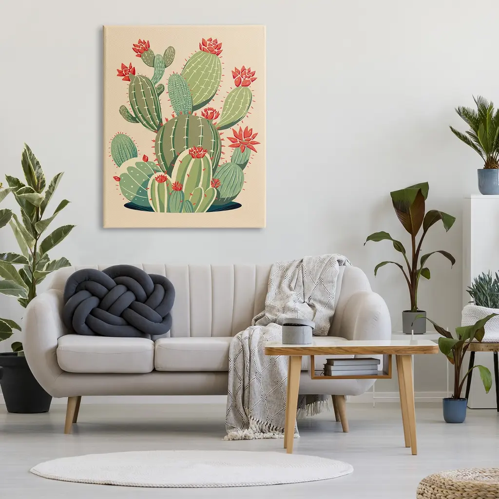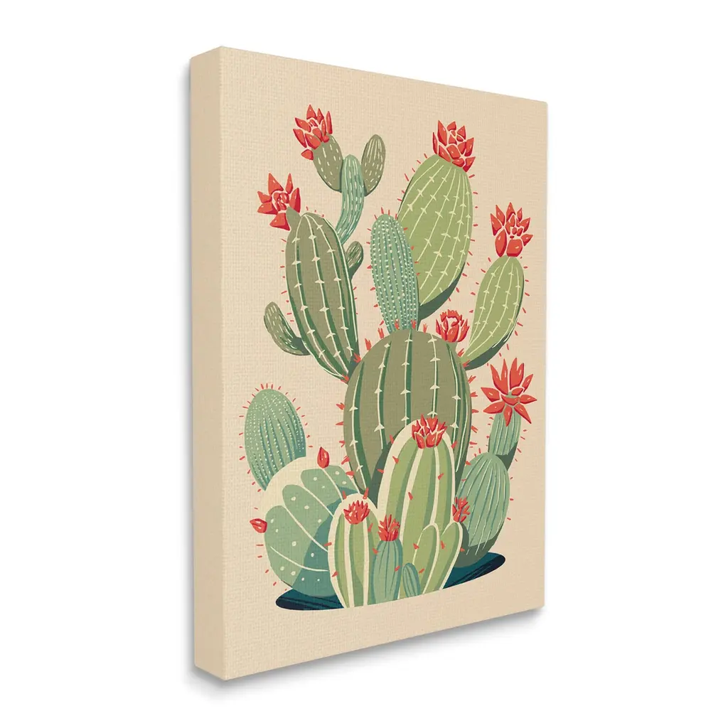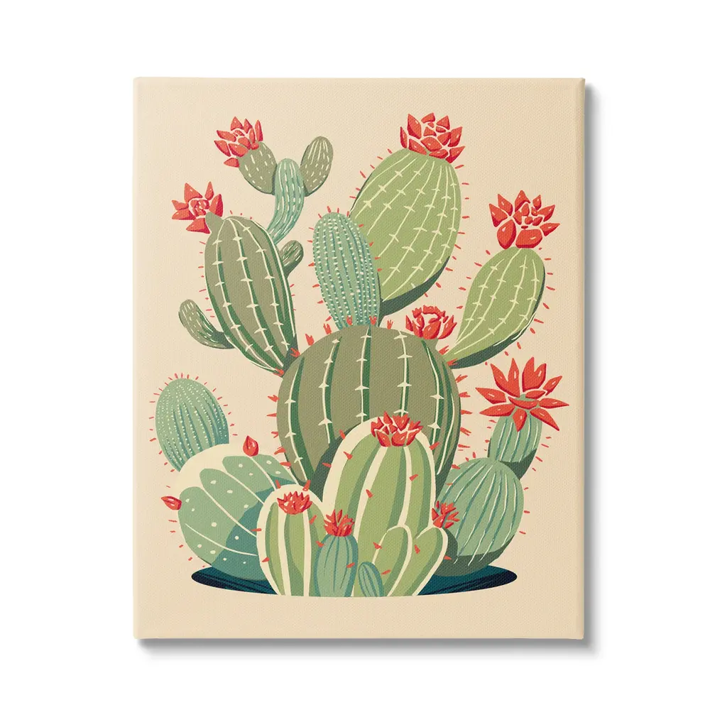 We create our stretched canvas to the highest standards. Using only the highest quality inks and canvas on Mimaki printers, we hand-cut and stretch each piece over a 1.5-inch thick wooden frame for hanging. As a result, the art comes ready to hang on the sturdy ledge with no installation required. Stupell Wall Art is made in the USA.Features: Dimensions: 16 x 1.5 x 20 InchesStretched Canvas Sizes Include Standard: 16 x 1.5 x 20 Large: 20 x 1.5 x 30 X-Large: 30 x 1.5 x 40 Oversized: 36 x 1.5 x 48Wall Art is Ready to Hang - No Installation or Hardware Needed. For Easy Set Up Lean or Layer Artwork on Shelf or Against Wall.Our stretched canvas is created with the highest standards. We use only the highest quality inks and canvas on our in house Mimaki printers, and then hand cut and stretch each piece over a 1.5 inch thick wooden frame for hanging. Made In USA.Artwork Relates To: Plant, Cactus, Prickly Pear, Cactus Flower, NatureDesign by Ziwei Li