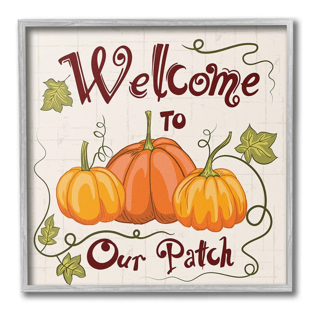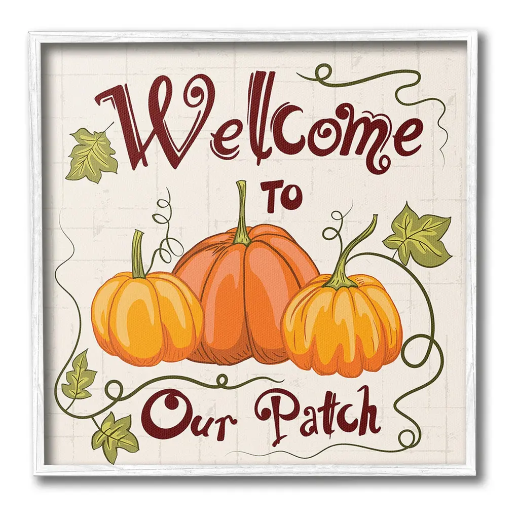 Elevate your home or office to the next level with Stupell Framed Floating Canvas Wall Art. Our premium hand-stretched canvas is mounted securely into a sturdy lightweight frame. The museum-style gap between the wrapped canvas and the box frame gives the illusion of floating artwork. Stupell Wall Art is made in the USA.Features: Dimensions: 18 x 1.7 x 18 Frame, 17 x 1.5 x 17 Canvas ArtFloating Frame Canvas Products are available in sizes 18"x18" and 25"x25". All Floating Frame Canvas Products have a 1.7" Depth.Wall Art is Ready to Hang with Hardware Free Hanging. No Installation required. For Easy Set Up Lean or Layer Artwork on Shelf or Against Wall. Artwork is Permently Fixed into the Frame.Our elevated 1.7" Thick Floating Frame is the perfect complement to our canvas style Wall Art. We use only the highest quality inks in house with industry leading printing solutions. Canvas is hand stretched over a durable wood foundation and then mounted securly into a Modern Box Frame. Made in the USA.Artwork Relates To: Nature, Country, Harvest, Plant, Fall, Autumn, Pumpkin, Phrase, Pattern, Welcome to our PatchDesign by Diane Labombarbe