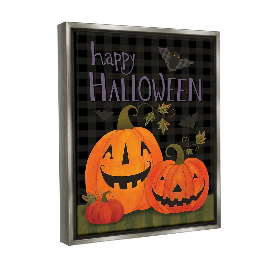 Elevate your home or office to the next level with Stupell Framed Floating Canvas Wall Art. Our premium hand-stretched canvas is mounted securely into a sturdy lightweight frame. The museum-style gap between the wrapped canvas and the box frame gives the illusion of floating artwork. Stupell Wall Art is made in the USA.Features: Dimensions: 17 x 1.7 x 21 Frame, 16 x 1.5 x 20 Canvas ArtFloating Frame Canvas Products are available in sizes 17"x21" and 25"x31". All Floating Frame Canvas Products have a 1.7" Depth.Wall Art is Ready to Hang with Hardware Free Hanging. No Installation required. For Easy Set Up Lean or Layer Artwork on Shelf or Against Wall. Artwork is Permently Fixed into the Frame.Our elevated 1.7" Thick Floating Frame is the perfect complement to our canvas style Wall Art. We use only the highest quality inks in house with industry leading printing solutions. Canvas is hand stretched over a durable wood foundation and then mounted securly into a Modern Box Frame. Made in the USA.Artwork Relates To: Festival, Halloween, Jack-o-lantern, Pumpkin, Botanical, Bat, Plaid, Pattern, Happy HalloweenDesign by Bernadette Deming