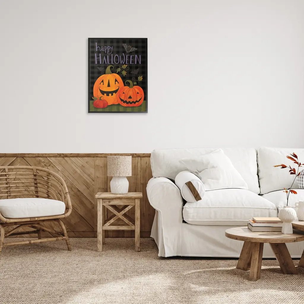 Add dimension to any room with our textured Framed Giclee Artwork. Our framed artwork is securely mounted into a 1.5-inch thick wood grain frame and ready to hang. Frames are available in three alluring styles: black, gray farmhouse and white. In addition, you should check out our oversized options if you want a statement piece. Stupell Wall Art is made in the USA.Features: Dimensions: 11 x 1.5 x 14 FramedFramed Giclee Products are available in the sizes 11"x14", 16"x20" or 24"x30". All Framed Giclee Products have a 1.5" Depth. Wall Art is Ready to Hang with Hardware Free Hanging. No installation required. For Easy Set Up Lean or Layer Artwork on Shelf or Against Wall.Our giclée prints are carefully mounted on a durable MDF backing, and then perfectly finished in a 1.5 inch thick woodgrain frame. Mounted frame colors include black, gray farmhouse and white. Made In USA.Artwork Relates To: Festival, Halloween, Jack-o-lantern, Pumpkin, Botanical, Bat, Plaid, Pattern, Happy HalloweenDesign by Bernadette Deming