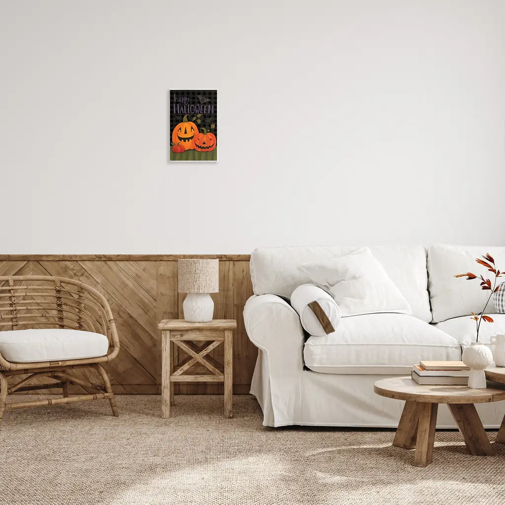 Our wall plaques start as high-quality lithograph prints mounted on durable 0.5-inch thick MDF wood. Each piece is hand finished and comes with a fresh layer of white foil on the sides to give it a crisp, clean look. Plaques arrive ready to hang without installation and come with removable plastic corners to keep them from damage in transit. Stupell Wall Art is made in the USA.Features: Dimensions: 10 x 0.5 x 15 InchesWall Plaque Product Sizes Include 10"x15" and 13"x19". All wall plaque products have a 0.5" Depth. Wall Art is Ready to Hang with Hardware Free Hanging. No installation required. For Easy Set Up Lean or Layer Artwork on Shelf or Against Wall.All of our wall plaques start off as high quality lithograph prints that are then mounted on durable 0.5 inch thick MDF wood. Each piece is hand finished and comes with a fresh layer of foil on the sides to give it a crisp clean look. Made In USA.Artwork Relates To: Festival, Halloween, Jack-o-lantern, Pumpkin, Botanical, Bat, Plaid, Pattern, Happy HalloweenDesign by Bernadette Deming