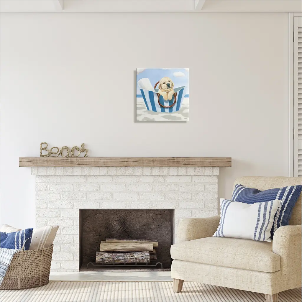 We create our stretched canvas to the highest standards. Using only the highest quality inks and canvas on Mimaki printers, we hand-cut and stretch each piece over a 1.5-inch thick wooden frame for hanging. As a result, the art comes ready to hang on the sturdy ledge with no installation required. Stupell Wall Art is made in the USA.Features: Dimensions: 17 x 1.5 x 17 InchesStretched Canvas Sizes Include Standard: 17 x 1.5 x 17 Large: 24 x 1.5 x 24 X-Large: 30 x 1.5 x 30 Oversized: 36 x 1.5 x 36Wall Art is Ready to Hang with Hardware Free Hanging. No installation required. For Easy Set Up Lean or Layer Artwork on Shelf or Against Wall.Our stretched canvas is created with the highest standards. We use only the highest quality inks and canvas on our in house Mimaki printers, and then hand cut and stretch each piece over a 1.5 inch thick wooden frame for hanging. Made In USA.Artwork Relates To: Animal, Canine, Dog, Mammal, Pet, Puppy, Bag, Basket, Towel, Beach, Shore, SandDesign by James Wiens