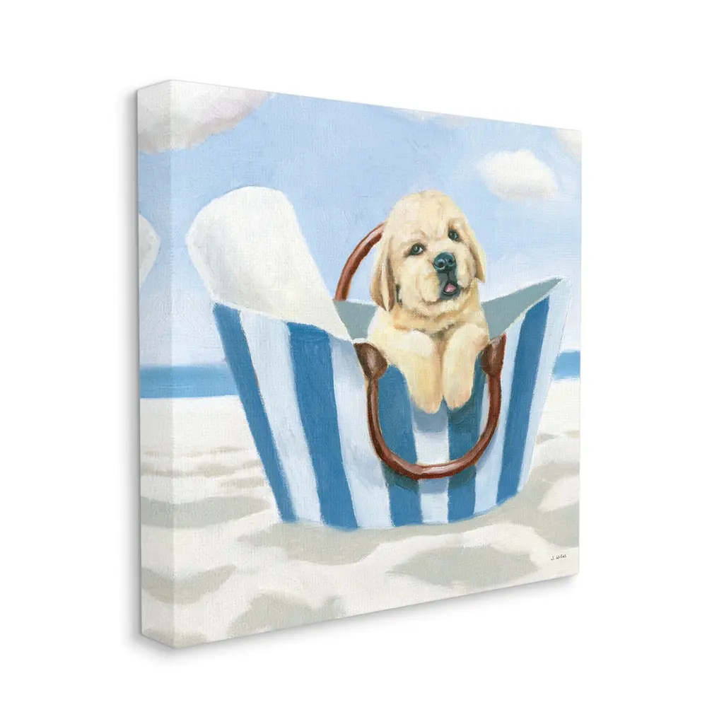 We create our stretched canvas to the highest standards. Using only the highest quality inks and canvas on Mimaki printers, we hand-cut and stretch each piece over a 1.5-inch thick wooden frame for hanging. As a result, the art comes ready to hang on the sturdy ledge with no installation required. Stupell Wall Art is made in the USA.Features: Dimensions: 17 x 1.5 x 17 InchesStretched Canvas Sizes Include Standard: 17 x 1.5 x 17 Large: 24 x 1.5 x 24 X-Large: 30 x 1.5 x 30 Oversized: 36 x 1.5 x 36Wall Art is Ready to Hang with Hardware Free Hanging. No installation required. For Easy Set Up Lean or Layer Artwork on Shelf or Against Wall.Our stretched canvas is created with the highest standards. We use only the highest quality inks and canvas on our in house Mimaki printers, and then hand cut and stretch each piece over a 1.5 inch thick wooden frame for hanging. Made In USA.Artwork Relates To: Animal, Canine, Dog, Mammal, Pet, Puppy, Bag, Basket, Towel, Beach, Shore, SandDesign by James Wiens