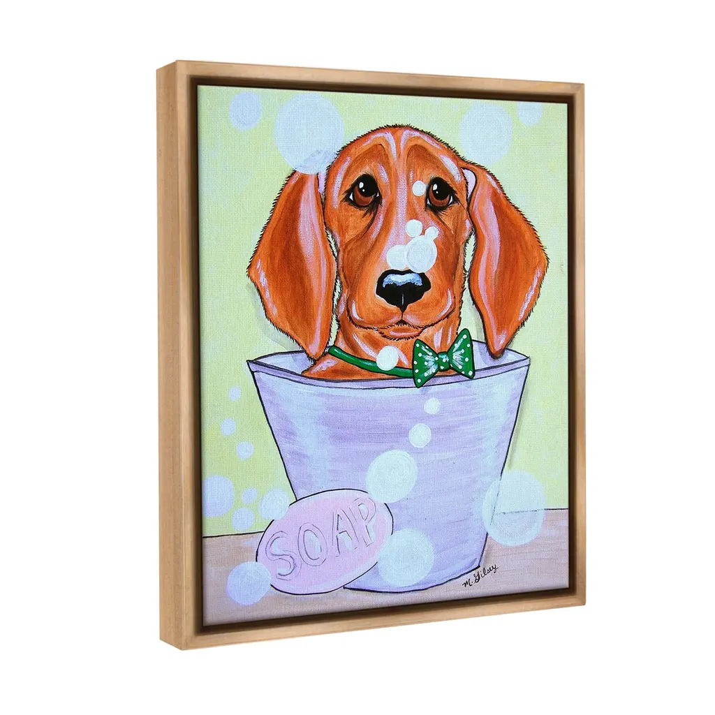 Elevate your home or office to the next level with Stupell Framed Floating Canvas Wall Art. Our premium hand-stretched canvas is mounted securely into a sturdy lightweight frame. The museum-style gap between the wrapped canvas and the box frame gives the illusion of floating artwork. Stupell Wall Art is made in the USA.Features: Dimensions: 17 x 1.7 x 21 Frame, 16 x 1.5 x 20 Canvas ArtFloating Frame Canvas Products are available in sizes 17"x21" and 25"x31". All Floating Frame Canvas Products have a 1.7" Depth.Wall Art is Ready to Hang with Hardware Free Hanging. No Installation required. For Easy Set Up Lean or Layer Artwork on Shelf or Against Wall. Artwork is Permently Fixed into the Frame.Our elevated 1.7" Thick Floating Frame is the perfect complement to our canvas style Wall Art. We use only the highest quality inks in house with industry leading printing solutions. Canvas is hand stretched over a durable wood foundation and then mounted securly into a Modern Box Frame. Made in the USA.Artwork Relates To: Bathroom, Bathtub, Tub, Hygiene, Soap, Bubbles, Dog, PetDesign by Michelle Gilsey