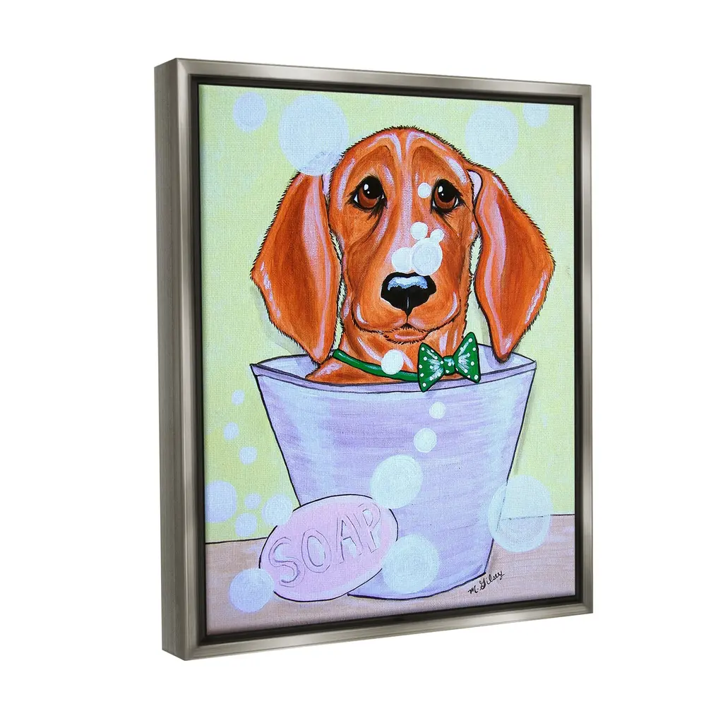 Elevate your home or office to the next level with Stupell Framed Floating Canvas Wall Art. Our premium hand-stretched canvas is mounted securely into a sturdy lightweight frame. The museum-style gap between the wrapped canvas and the box frame gives the illusion of floating artwork. Stupell Wall Art is made in the USA.Features: Dimensions: 17 x 1.7 x 21 Frame, 16 x 1.5 x 20 Canvas ArtFloating Frame Canvas Products are available in sizes 17"x21" and 25"x31". All Floating Frame Canvas Products have a 1.7" Depth.Wall Art is Ready to Hang with Hardware Free Hanging. No Installation required. For Easy Set Up Lean or Layer Artwork on Shelf or Against Wall. Artwork is Permently Fixed into the Frame.Our elevated 1.7" Thick Floating Frame is the perfect complement to our canvas style Wall Art. We use only the highest quality inks in house with industry leading printing solutions. Canvas is hand stretched over a durable wood foundation and then mounted securly into a Modern Box Frame. Made in the USA.Artwork Relates To: Bathroom, Bathtub, Tub, Hygiene, Soap, Bubbles, Dog, PetDesign by Michelle Gilsey