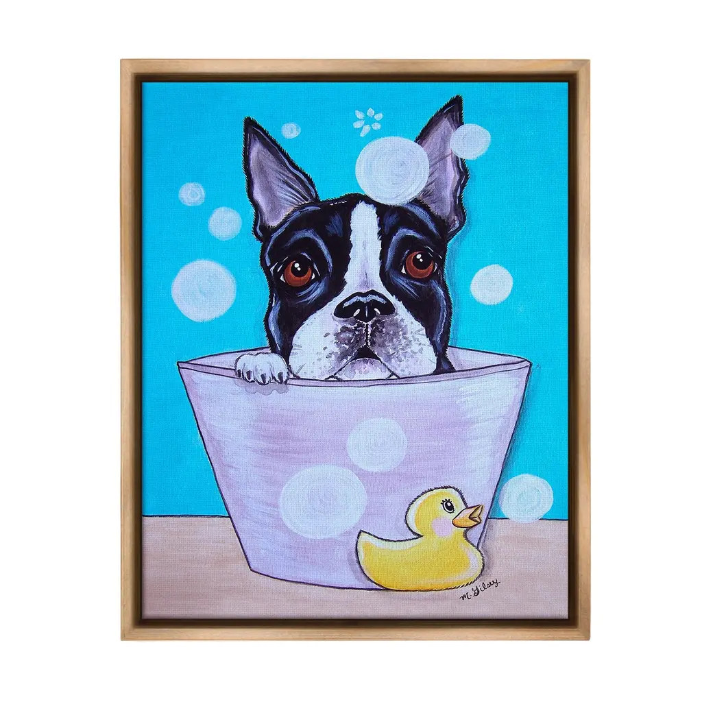 Add dimension to any room with our textured Framed Giclee Artwork. Our framed artwork is securely mounted into a 1.5-inch thick wood grain frame and ready to hang. Frames are available in three alluring styles: black, gray farmhouse and white. In addition, you should check out our oversized options if you want a statement piece. Stupell Wall Art is made in the USA.Features: Dimensions: 11 x 1.5 x 14 FramedFramed Giclee Products are available in the sizes 11"x14", 16"x20" or 24"x30". All Framed Giclee Products have a 1.5" Depth. Wall Art is Ready to Hang with Hardware Free Hanging. No installation required. For Easy Set Up Lean or Layer Artwork on Shelf or Against Wall.Our giclée prints are carefully mounted on a durable MDF backing, and then perfectly finished in a 1.5 inch thick woodgrain frame. Mounted frame colors include black, gray farmhouse and white. Made In USA.Artwork Relates To: Bathroom, Bathtub, Tub, Hygiene, Soap, Bubbles, Dog, PetDesign by Michelle Gilsey