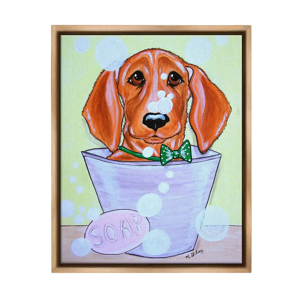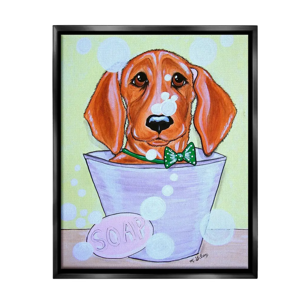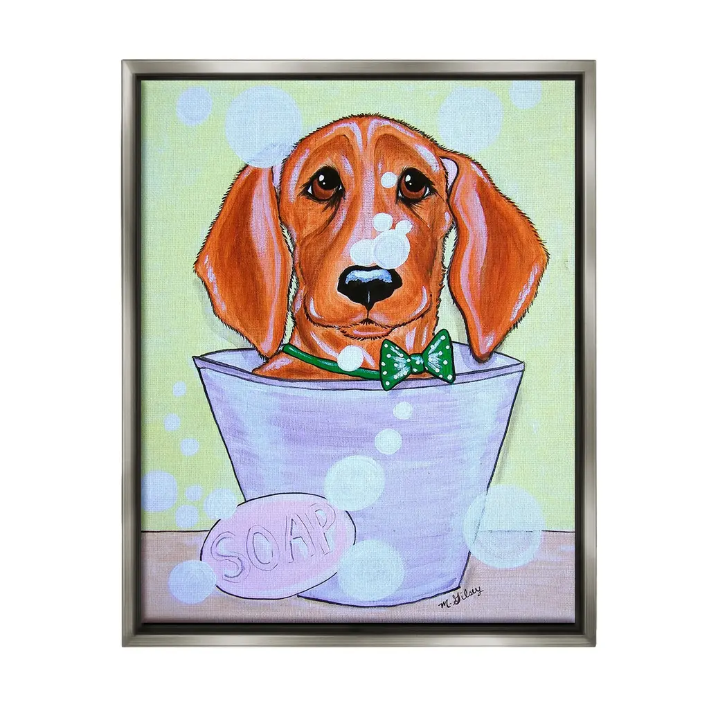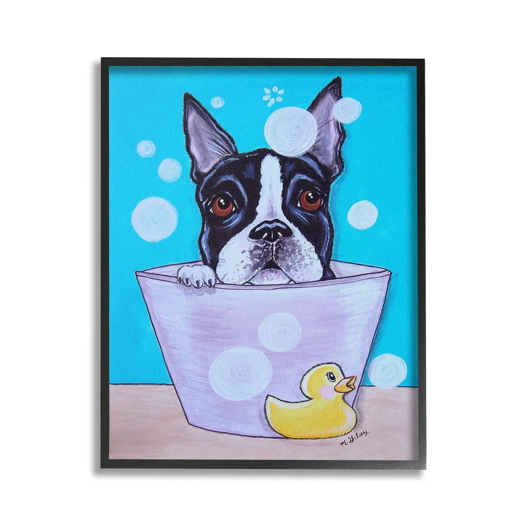 Add dimension to any room with our textured Framed Giclee Artwork. Our framed artwork is securely mounted into a 1.5-inch thick wood grain frame and ready to hang. Frames are available in three alluring styles: black, gray farmhouse and white. In addition, you should check out our oversized options if you want a statement piece. Stupell Wall Art is made in the USA.Features: Dimensions: 11 x 1.5 x 14 FramedFramed Giclee Products are available in the sizes 11"x14", 16"x20" or 24"x30". All Framed Giclee Products have a 1.5" Depth. Wall Art is Ready to Hang with Hardware Free Hanging. No installation required. For Easy Set Up Lean or Layer Artwork on Shelf or Against Wall.Our giclée prints are carefully mounted on a durable MDF backing, and then perfectly finished in a 1.5 inch thick woodgrain frame. Mounted frame colors include black, gray farmhouse and white. Made In USA.Artwork Relates To: Bathroom, Bathtub, Tub, Hygiene, Soap, Bubbles, Dog, PetDesign by Michelle Gilsey