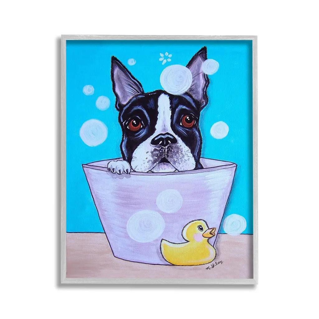 Our wall plaques start as high-quality lithograph prints mounted on durable 0.5-inch thick MDF wood. Each piece is hand finished and comes with a fresh layer of white foil on the sides to give it a crisp, clean look. Plaques arrive ready to hang without installation and come with removable plastic corners to keep them from damage in transit. Stupell Wall Art is made in the USA.Features: Dimensions: 10 x 0.5 x 15 InchesWall Plaque Product Sizes Include 10"x15" and 13"x19". All wall plaque products have a 0.5" Depth. Wall Art is Ready to Hang with Hardware Free Hanging. No installation required. For Easy Set Up Lean or Layer Artwork on Shelf or Against Wall.All of our wall plaques start off as high quality lithograph prints that are then mounted on durable 0.5 inch thick MDF wood. Each piece is hand finished and comes with a fresh layer of foil on the sides to give it a crisp clean look. Made In USA.Artwork Relates To: Bathroom, Bathtub, Tub, Hygiene, Soap, Bubbles, Dog, PetDesign by Michelle Gilsey