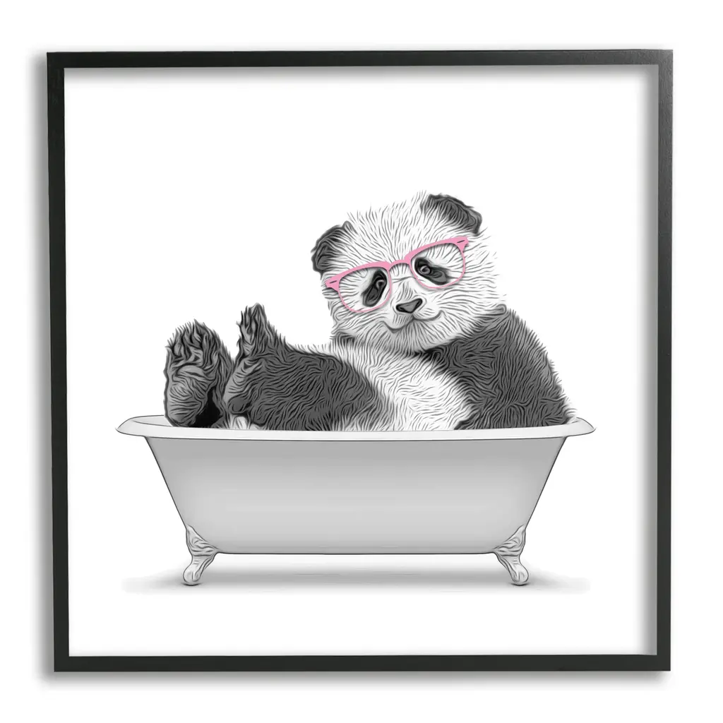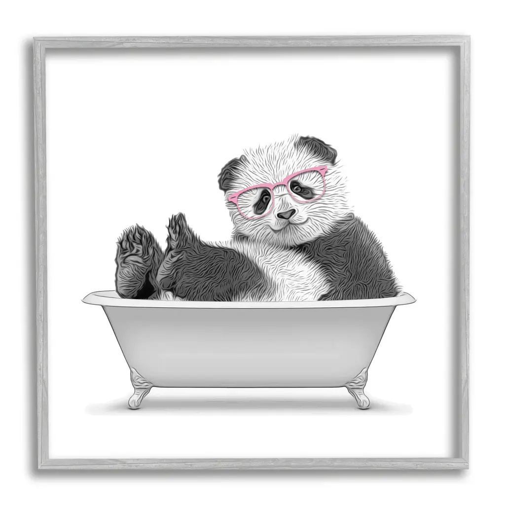 Stupell Quirky Panda Bathtub Pink Glasses Minimal Design Framed Wall Art - Grey - 12 X 12 - Black