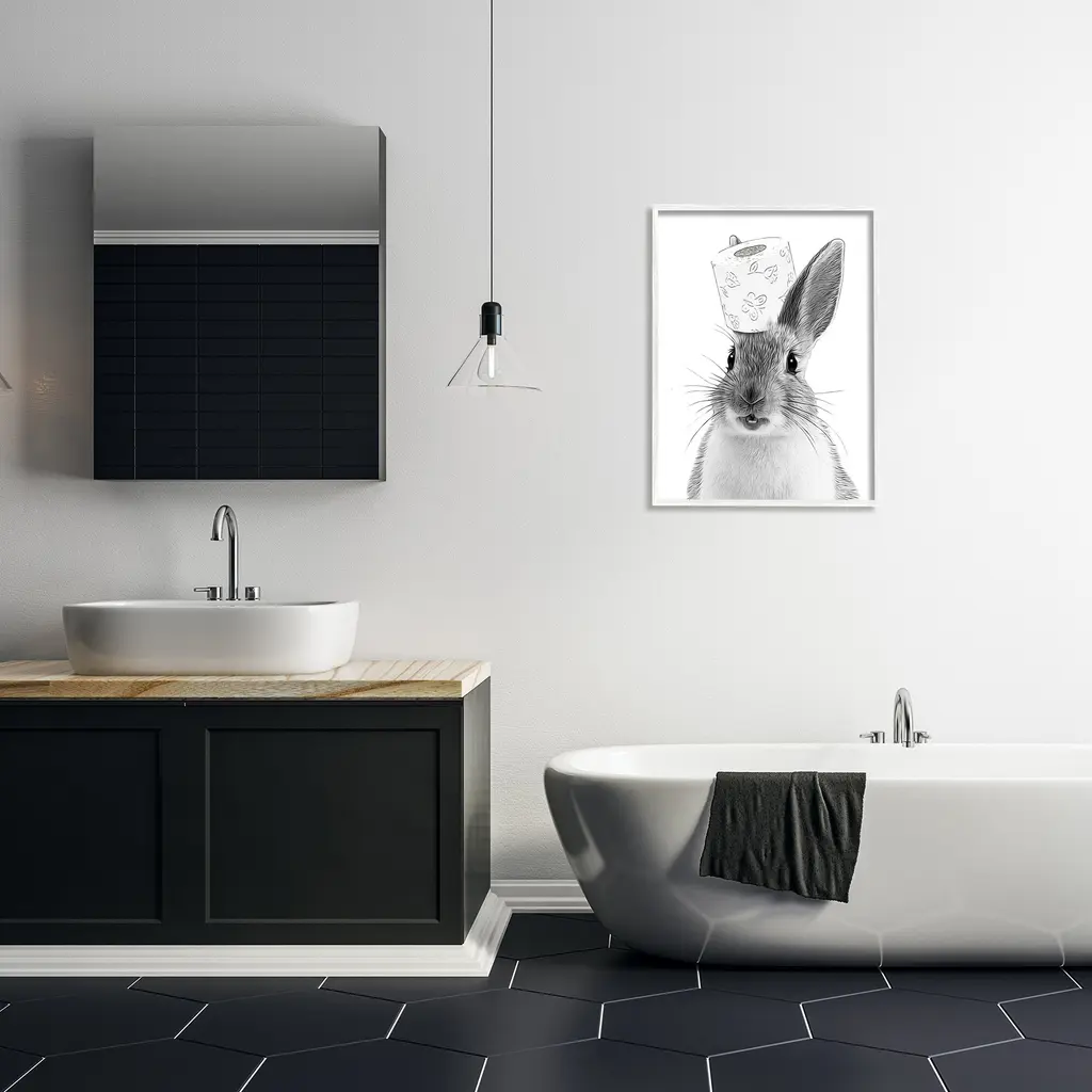 Add dimension to any room with our textured Framed Giclee Artwork. Our framed artwork is securely mounted into a 1.5-inch thick wood grain frame and ready to hang. Frames are available in three alluring styles: black, gray farmhouse and white. In addition, you should check out our oversized options if you want a statement piece. Stupell Wall Art is made in the USA.Features: Dimensions: 11 x 1.5 x 14 FramedFramed Giclee Sizes Include Standard: 11 x 1.5 x 14 Large: 16 x 1.5 x 20 Oversized: 24 x 1.5 x 30Wall Art is Ready to Hang - No Installation or Hardware Needed. For Easy Set Up Lean or Layer Artwork on Shelf or Against Wall.Our giclée prints are carefully mounted on a durable MDF backing, and then perfectly finished in a 1.5 inch thick woodgrain frame. Mounted frame colors include black, gray farmhouse and white. Made In USA.Artwork Relates To: Animal, Mammal, Wildlife, Bathroom, Rabbit, BunnyDesign by Annalisa Latella