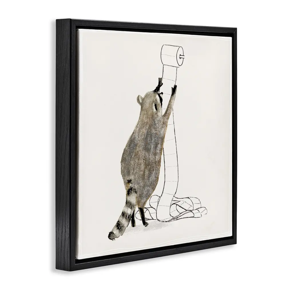 Elevate your home or office to the next level with Stupell Framed Floating Canvas Wall Art. Our premium hand-stretched canvas is mounted securely into a sturdy lightweight frame. The museum-style gap between the wrapped canvas and the box frame gives the illusion of floating artwork. Stupell Wall Art is made in the USA.Features: Dimensions: 18 x 1.7 x 18 Frame, 17 x 1.5 x 17 Canvas ArtFloating Frame Canvas Products are available in sizes 18"x18" and 25"x25". All Floating Frame Canvas Products have a 1.7" Depth.Wall Art is Ready to Hang with Hardware Free Hanging. No Installation required. For Easy Set Up Lean or Layer Artwork on Shelf or Against Wall. Artwork is Permently Fixed into the Frame.Our elevated 1.7" Thick Floating Frame is the perfect complement to our canvas style Wall Art. We use only the highest quality inks in house with industry leading printing solutions. Canvas is hand stretched over a durable wood foundation and then mounted securly into a Modern Box Frame. Made in the USA.Artwork Relates To: Bathroom, Animal, Humor, Raccoon, Toilet Paper, WoodlandDesign by Victoria Barnes