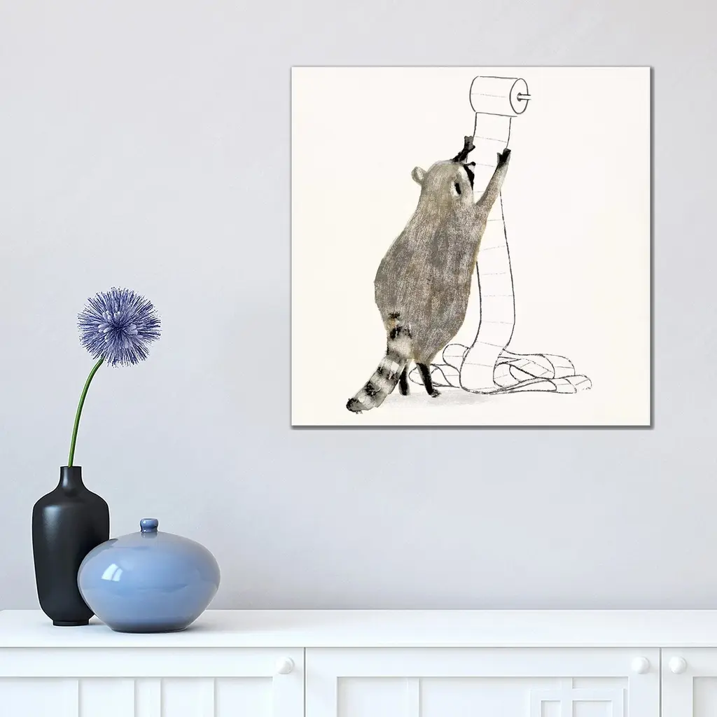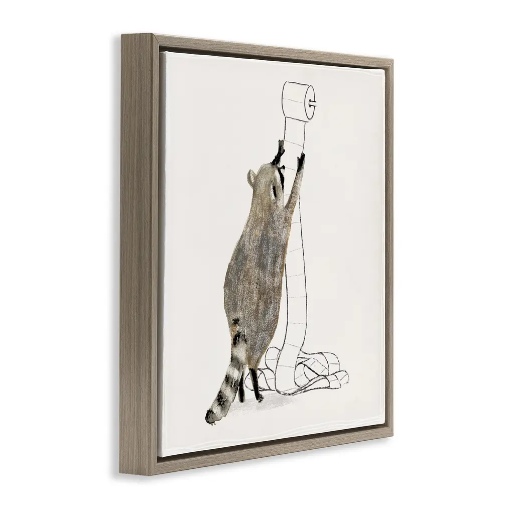 Elevate your home or office to the next level with Stupell Framed Floating Canvas Wall Art. Our premium hand-stretched canvas is mounted securely into a sturdy lightweight frame. The museum-style gap between the wrapped canvas and the box frame gives the illusion of floating artwork. Stupell Wall Art is made in the USA.Features: Dimensions: 18 x 1.7 x 18 Frame, 17 x 1.5 x 17 Canvas ArtFloating Frame Canvas Products are available in sizes 18"x18" and 25"x25". All Floating Frame Canvas Products have a 1.7" Depth.Wall Art is Ready to Hang with Hardware Free Hanging. No Installation required. For Easy Set Up Lean or Layer Artwork on Shelf or Against Wall. Artwork is Permently Fixed into the Frame.Our elevated 1.7" Thick Floating Frame is the perfect complement to our canvas style Wall Art. We use only the highest quality inks in house with industry leading printing solutions. Canvas is hand stretched over a durable wood foundation and then mounted securly into a Modern Box Frame. Made in the USA.Artwork Relates To: Bathroom, Animal, Humor, Raccoon, Toilet Paper, WoodlandDesign by Victoria Barnes