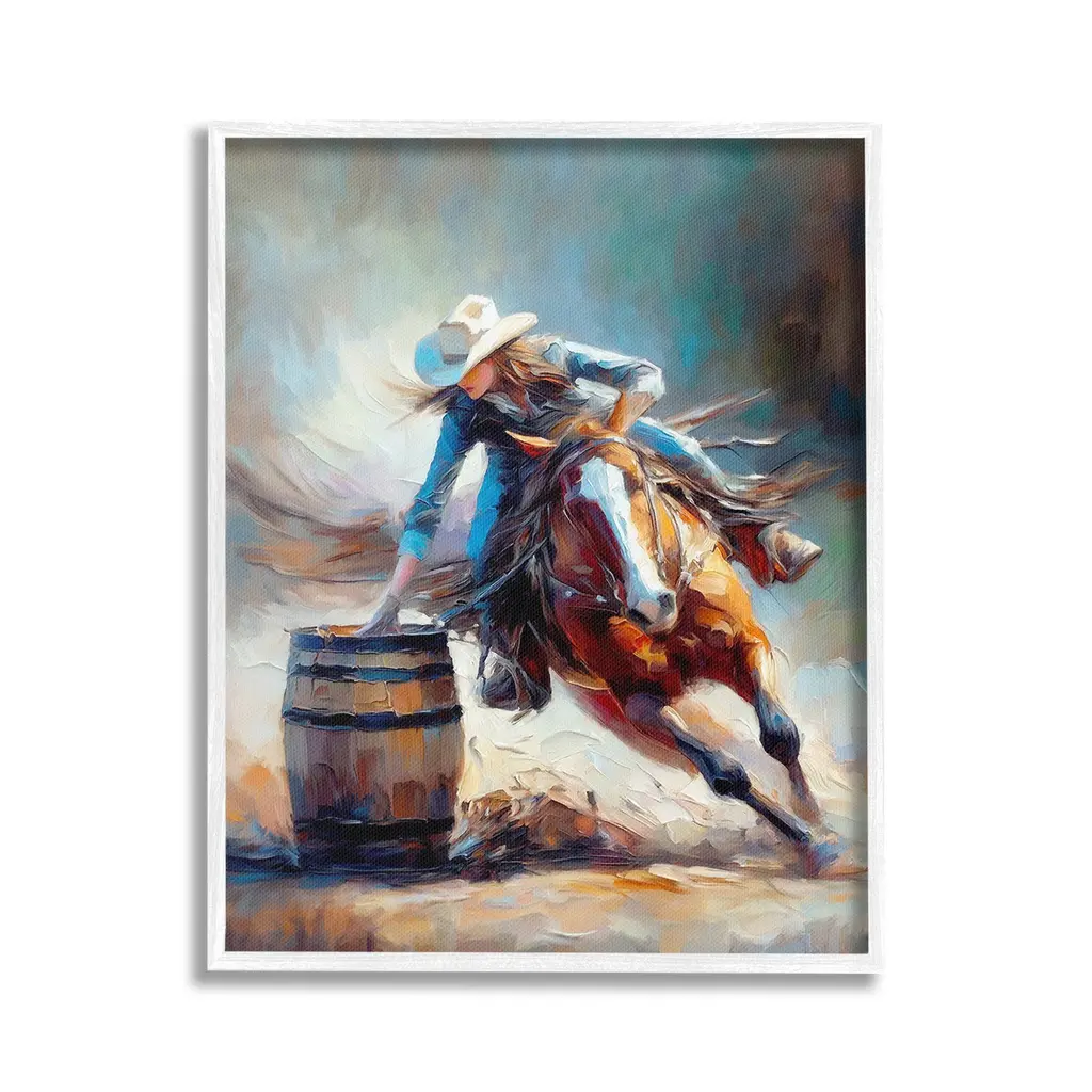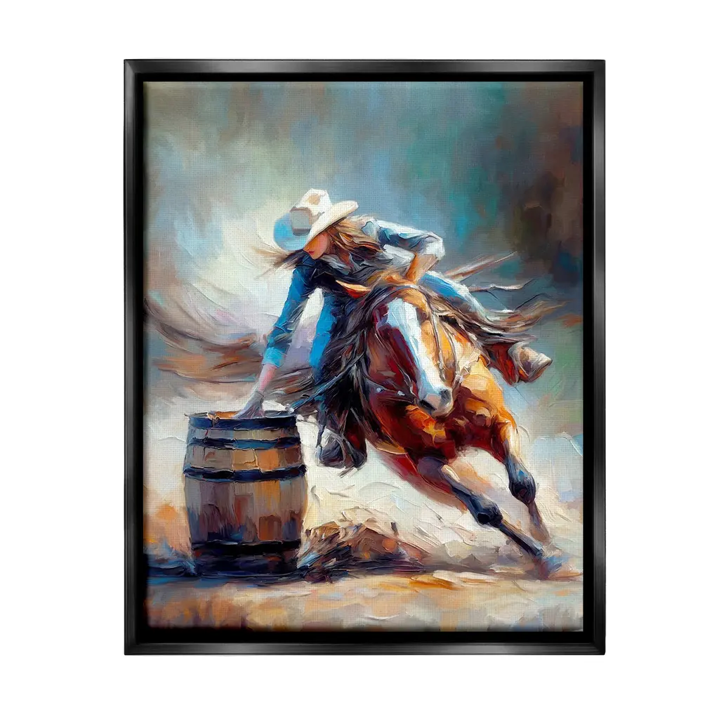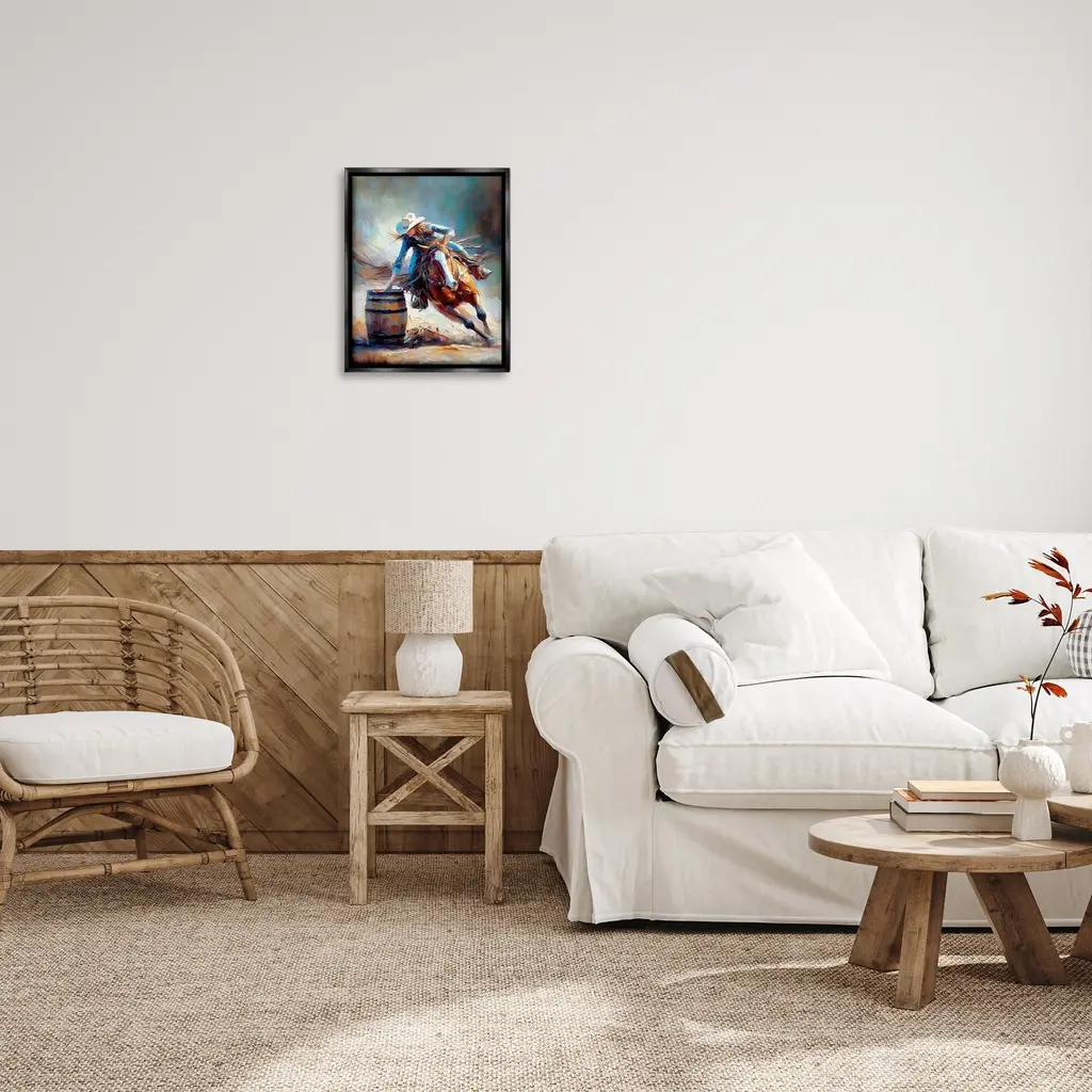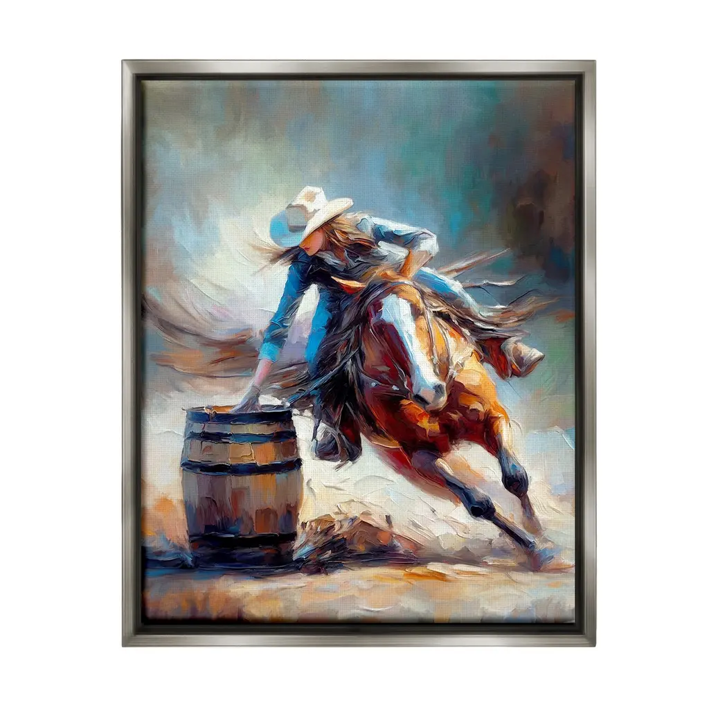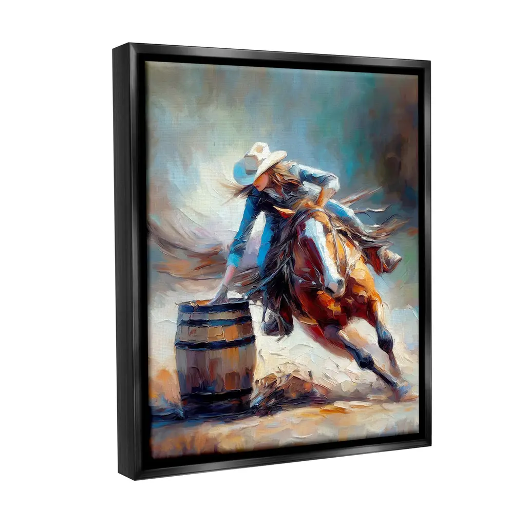Elevate your home or office to the next level with Stupell Framed Floating Canvas Wall Art. Our premium hand-stretched canvas is mounted securely into a sturdy lightweight frame. The museum-style gap between the wrapped canvas and the box frame gives the illusion of floating artwork. Stupell Wall Art is made in the USA.Features: Dimensions: 17 x 1.7 x 21 Frame, 16 x 1.5 x 20 Canvas ArtFloating Frame Canvas Products are available in sizes 17"x21" and 25"x31". All Floating Frame Canvas Products have a 1.7" Depth.Wall Art is Ready to Hang with Hardware Free Hanging. No Installation required. For Easy Set Up Lean or Layer Artwork on Shelf or Against Wall. Artwork is Permently Fixed into the Frame.Our elevated 1.7" Thick Floating Frame is the perfect complement to our canvas style Wall Art. We use only the highest quality inks in house with industry leading printing solutions. Canvas is hand stretched over a durable wood foundation and then mounted securly into a Modern Box Frame. Made in the USA.Artwork Relates To: Equestrian, Rodeo, Country, Southwestern, Cowgirl, Animal, Horse, Racing, GallopingDesign by Ramona Murdock