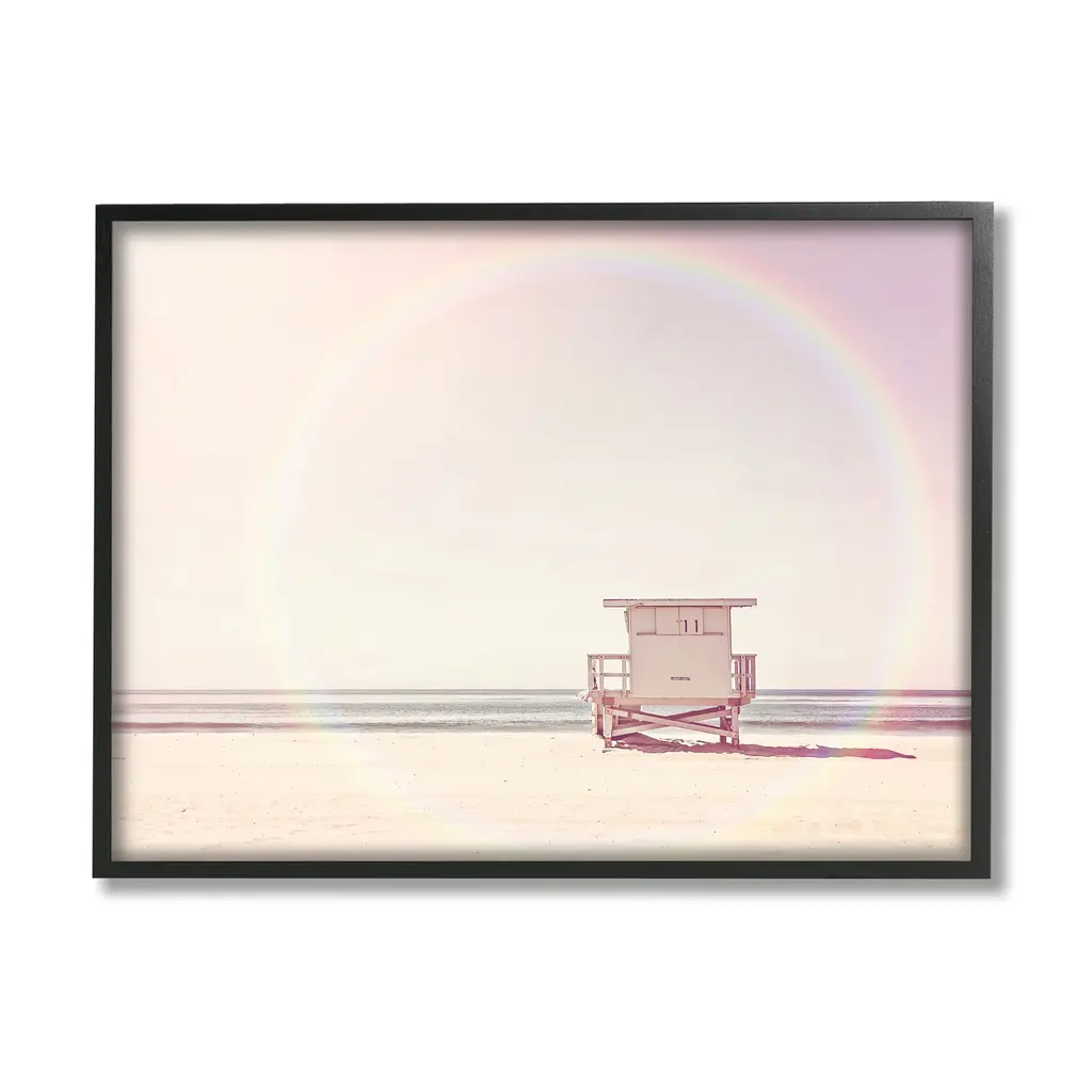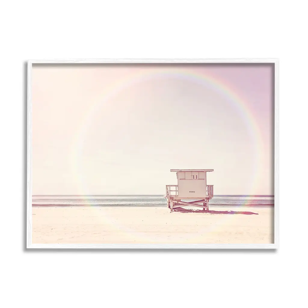 Add dimension to any room with our textured Framed Giclee Artwork. Our framed artwork is securely mounted into a 1.5-inch thick wood grain frame and ready to hang. Frames are available in three alluring styles: black, gray farmhouse and white. In addition, you should check out our oversized options if you want a statement piece. Stupell Wall Art is made in the USA.Features: Dimensions: 14 x 1.5 x 11 FramedFramed Giclee Sizes Include Standard: 14 x 1.5 x 11 Large: 20 x 1.5 x 16 Oversized: 30 x 1.5 x 24Wall Art is Ready to Hang with Hardware Free Hanging. No installation required. For Easy Set Up Lean or Layer Artwork on Shelf or Against Wall.Our giclée prints are carefully mounted on a durable MDF backing, and then perfectly finished in a 1.5 inch thick woodgrain frame. Mounted frame colors include black, gray farmhouse and white. Made In USA.Artwork Relates To: Sky, Beach, Coast, Sea, Shoreline, Water, Scenery, Horizon, Summer, Waterfront, Rural, Rainbow, Landscape, Lifeguard HutDesign by Sisi and Seb