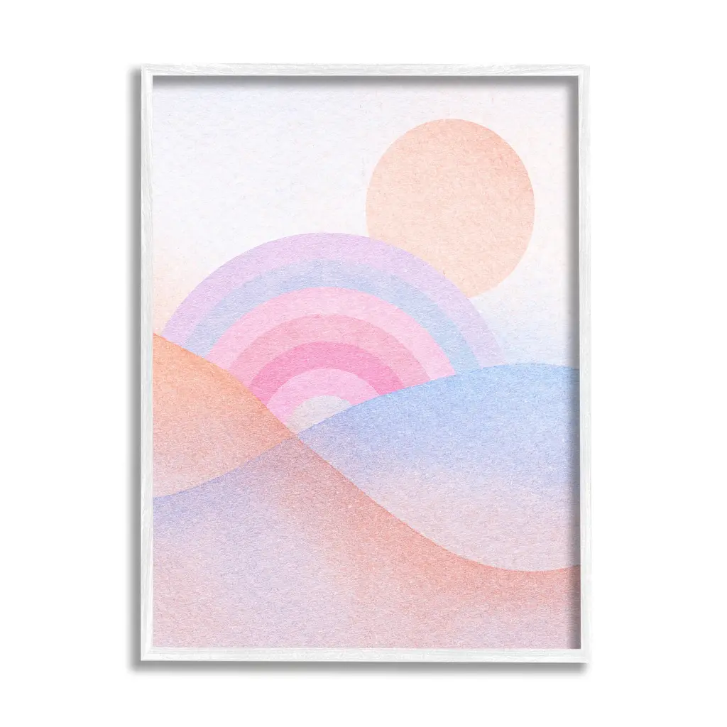 Add dimension to any room with our textured Framed Giclee Artwork. Our framed artwork is securely mounted into a 1.5-inch thick wood grain frame and ready to hang. Frames are available in three alluring styles: black, gray farmhouse and white. In addition, you should check out our oversized options if you want a statement piece. Stupell Wall Art is made in the USA.Features: Dimensions: 11 x 1.5 x 14 FramedFramed Giclee Sizes Include Standard: 11 x 1.5 x 14 Large: 16 x 1.5 x 20 Oversized: 24 x 1.5 x 30Wall Art is Ready to Hang - No Installation or Hardware Needed. For Easy Set Up Lean or Layer Artwork on Shelf or Against Wall.Our giclée prints are carefully mounted on a durable MDF backing, and then perfectly finished in a 1.5 inch thick woodgrain frame. Mounted frame colors include black, gray farmhouse and white. Made In USA.Artwork Relates To: Modern, Rainbow, Landscape, Sun, HillsDesign by Lil' Rue