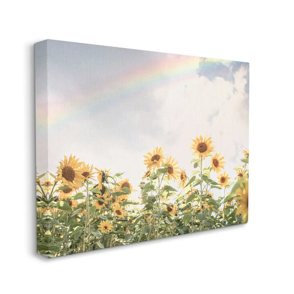 We create our stretched canvas to the highest standards. Using only the highest quality inks and canvas on Mimaki printers, we hand-cut and stretch each piece over a 1.5-inch thick wooden frame for hanging. As a result, the art comes ready to hang on the sturdy ledge with no installation required. Stupell Wall Art is made in the USA.Features: Dimensions: 20 x 1.5 x 16 InchesStretched Canvas Sizes Include Standard: 20 x 1.5 x 16 Large: 30 x 1.5 x 20 X-Large: 40 x 1.5 x 30 Oversized: 48 x 1.5 x 36Wall Art is Ready to Hang with Hardware Free Hanging. No installation required. For Easy Set Up Lean or Layer Artwork on Shelf or Against Wall.Our stretched canvas is created with the highest standards. We use only the highest quality inks and canvas on our in house Mimaki printers, and then hand cut and stretch each piece over a 1.5 inch thick wooden frame for hanging. Made In USA.Artwork Relates To: Nature, Outdoors, Sky, Flower, Plant, Sunflower, Vegetation, Summer, Petal, Rainbow, Leaf, Landscape, Field, Scenery, Agriculture, CountrysideDesign by Sisi and Seb