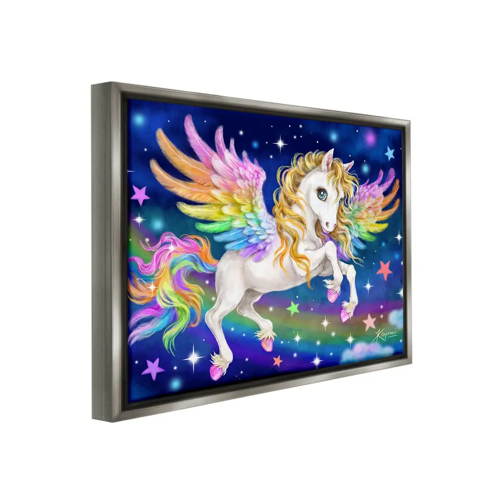 Elevate your home or office to the next level with Stupell Framed Floating Canvas Wall Art. Our premium hand-stretched canvas is mounted securely into a sturdy lightweight frame. The museum-style gap between the wrapped canvas and the box frame gives the illusion of floating artwork. Stupell Wall Art is made in the USA.Features: Dimensions: 21 x 1.7 x 17 Frame, 20 x 1.5 x 16 Canvas ArtFloating Frame Canvas Products are available in sizes 21"x17" and 31"x25". All Floating Frame Canvas Products have a 1.7" Depth.Wall Art is Ready to Hang with Hardware Free Hanging. No Installation required. For Easy Set Up Lean or Layer Artwork on Shelf or Against Wall. Artwork is Permently Fixed into the Frame.Our elevated 1.7" Thick Floating Frame is the perfect complement to our canvas style Wall Art. We use only the highest quality inks in house with industry leading printing solutions. Canvas is hand stretched over a durable wood foundation and then mounted securly into a Modern Box Frame. Made in the USA.Artwork Relates To: Modern, Animal, Horse, Unicorn, Fantasy, Rainbow, Stars, Pattern, CloudsDesign by Kayomi Harai