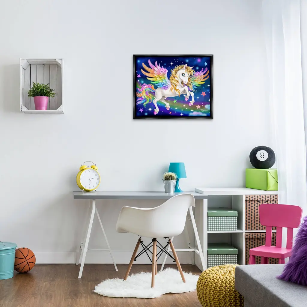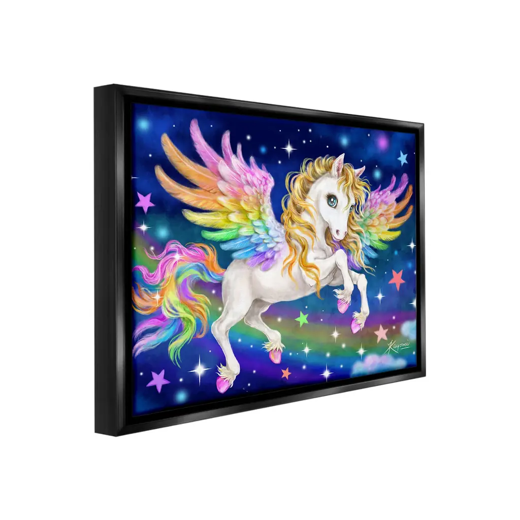 Elevate your home or office to the next level with Stupell Framed Floating Canvas Wall Art. Our premium hand-stretched canvas is mounted securely into a sturdy lightweight frame. The museum-style gap between the wrapped canvas and the box frame gives the illusion of floating artwork. Stupell Wall Art is made in the USA.Features: Dimensions: 21 x 1.7 x 17 Frame, 20 x 1.5 x 16 Canvas ArtFloating Frame Canvas Products are available in sizes 21"x17" and 31"x25". All Floating Frame Canvas Products have a 1.7" Depth.Wall Art is Ready to Hang with Hardware Free Hanging. No Installation required. For Easy Set Up Lean or Layer Artwork on Shelf or Against Wall. Artwork is Permently Fixed into the Frame.Our elevated 1.7" Thick Floating Frame is the perfect complement to our canvas style Wall Art. We use only the highest quality inks in house with industry leading printing solutions. Canvas is hand stretched over a durable wood foundation and then mounted securly into a Modern Box Frame. Made in the USA.Artwork Relates To: Modern, Animal, Horse, Unicorn, Fantasy, Rainbow, Stars, Pattern, CloudsDesign by Kayomi Harai