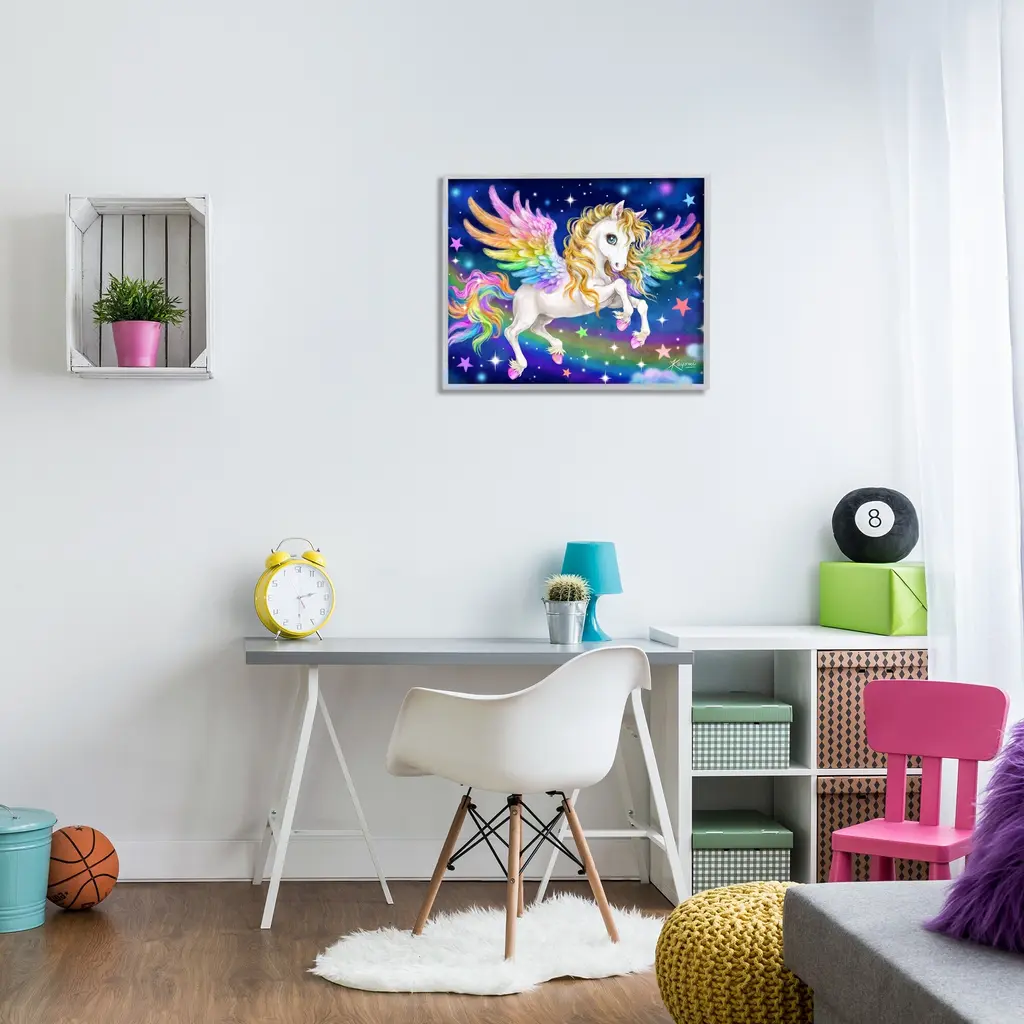 Add dimension to any room with our textured Framed Giclee Artwork. Our framed artwork is securely mounted into a 1.5-inch thick wood grain frame and ready to hang. Frames are available in three alluring styles: black, gray farmhouse and white. In addition, you should check out our oversized options if you want a statement piece. Stupell Wall Art is made in the USA.Features: Dimensions: 14 x 1.5 x 11 FramedFramed Giclee Products are available in the sizes 14"x11", 20"x16" or 30"x24". All Framed Giclee Products have a 1.5" Depth. Wall Art is Ready to Hang with Hardware Free Hanging. No installation required. For Easy Set Up Lean or Layer Artwork on Shelf or Against Wall.Our giclée prints are carefully mounted on a durable MDF backing, and then perfectly finished in a 1.5 inch thick woodgrain frame. Mounted frame colors include black, gray farmhouse and white. Made In USA.Artwork Relates To: Modern, Animal, Horse, Unicorn, Fantasy, Rainbow, Stars, Pattern, CloudsDesign by Kayomi Harai