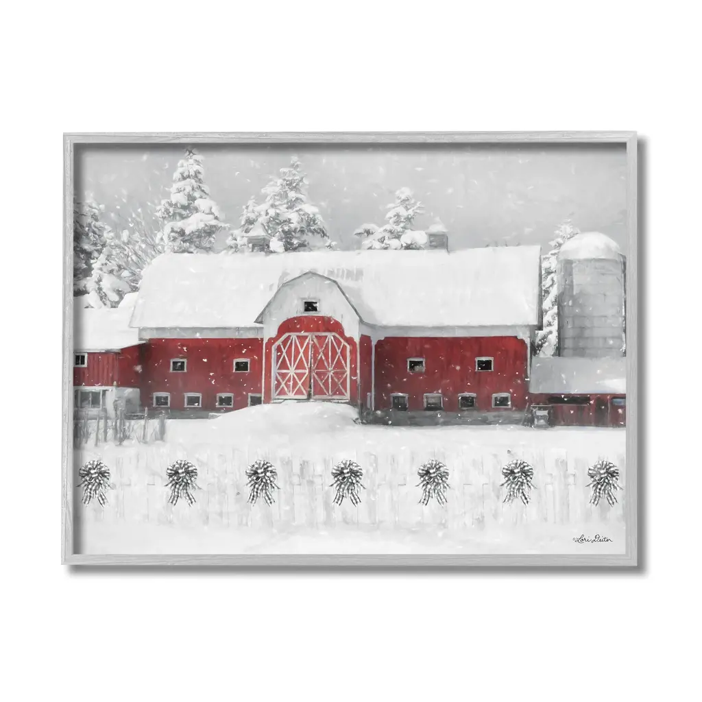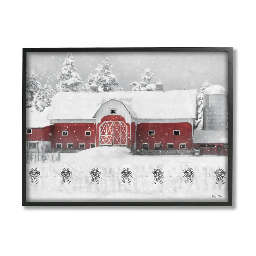 Stupell Red Barn Winter Scene Farm Charm Snowfall Framed Wall Art - 16 X 20 - Black