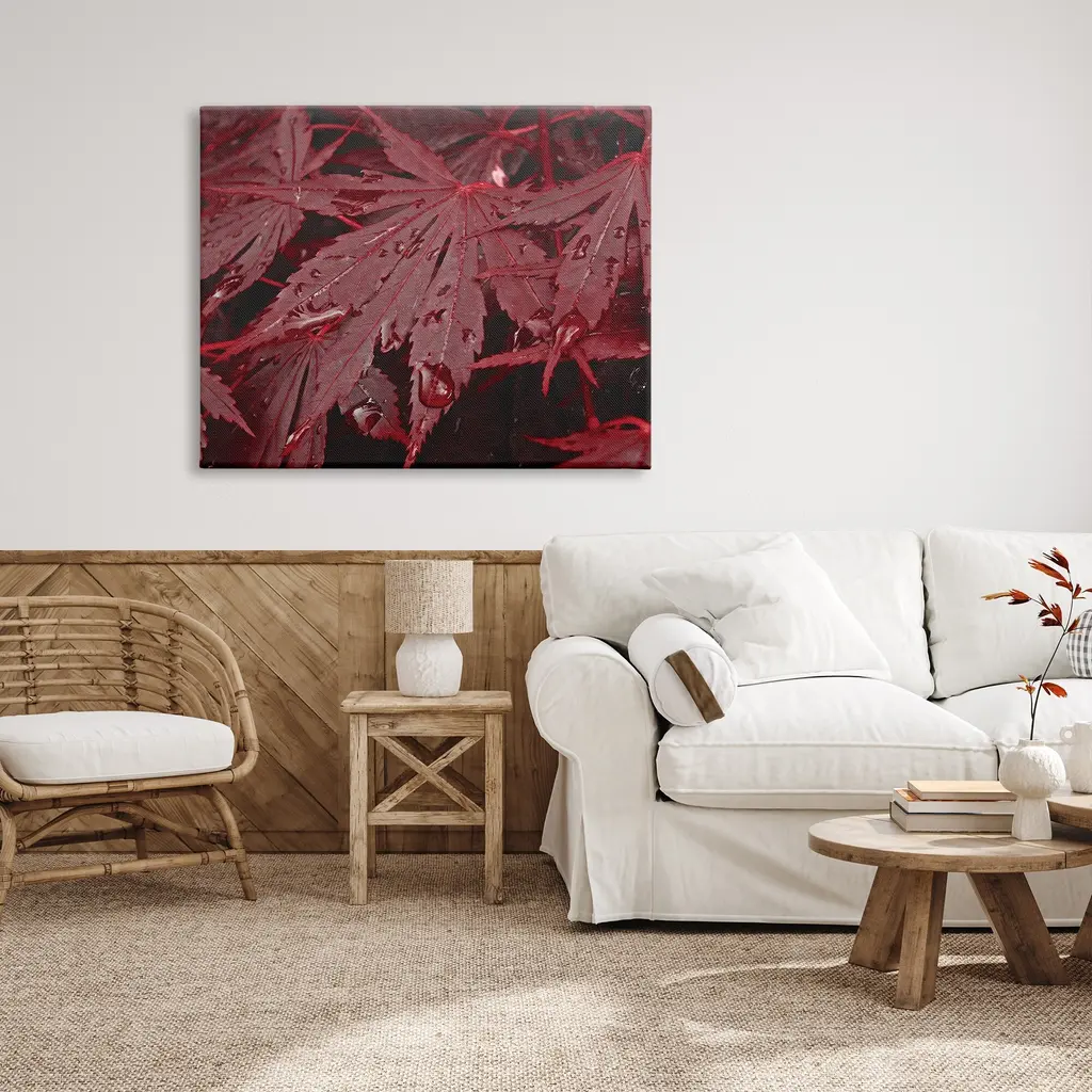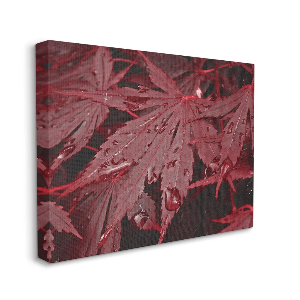 We create our stretched canvas to the highest standards. Using only the highest quality inks and canvas on Mimaki printers, we hand-cut and stretch each piece over a 1.5-inch thick wooden frame for hanging. As a result, the art comes ready to hang on the sturdy ledge with no installation required. Stupell Wall Art is made in the USA.Features: Dimensions: 20 x 1.5 x 16 InchesStretched Canvas Sizes Include Standard: 20 x 1.5 x 16 Large: 30 x 1.5 x 20 X-Large: 40 x 1.5 x 30 Oversized: 48 x 1.5 x 36Wall Art is Ready to Hang with Hardware Free Hanging. No installation required. For Easy Set Up Lean or Layer Artwork on Shelf or Against Wall.Our stretched canvas is created with the highest standards. We use only the highest quality inks and canvas on our in house Mimaki printers, and then hand cut and stretch each piece over a 1.5 inch thick wooden frame for hanging. Made In USA.Artwork Relates To: Leaf, Plant, Tree, Maple, Maroon, Water Droplets, Photography, NatureDesign by Lil' Rue