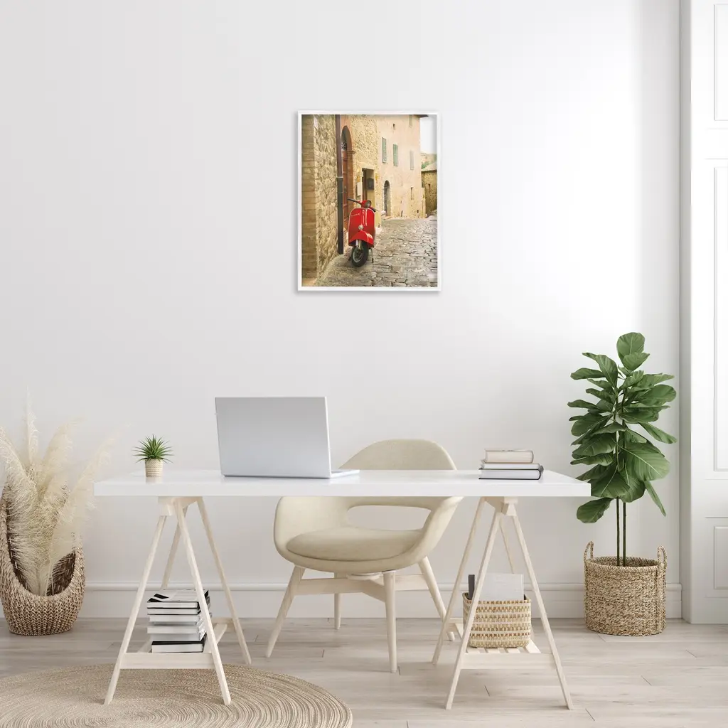 Add dimension to any room with our textured Framed Giclee Artwork. Our framed artwork is securely mounted into a 1.5-inch thick wood grain frame and ready to hang. Frames are available in three alluring styles: black, gray farmhouse and white. In addition, you should check out our oversized options if you want a statement piece. Stupell Wall Art is made in the USA.Features: Dimensions: 11 x 1.5 x 14 FramedFramed Giclee Products are available in the sizes 11"x14", 16"x20" or 24"x30". All Framed Giclee Products have a 1.5" Depth. Wall Art is Ready to Hang with Hardware Free Hanging. No installation required. For Easy Set Up Lean or Layer Artwork on Shelf or Against Wall.Our giclée prints are carefully mounted on a durable MDF backing, and then perfectly finished in a 1.5 inch thick woodgrain frame. Mounted frame colors include black, gray farmhouse and white. Made In USA.Artwork Relates To: Scooter, Vehicle, Motorcycle, City, Road, Street, Urban, Motor Scooter, Path, Moped, Cobblestone, ArchitectureDesign by Aledanda