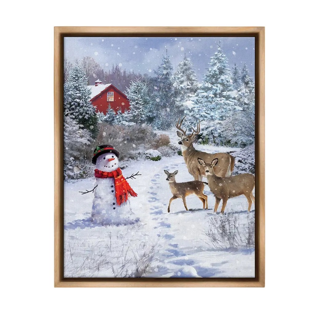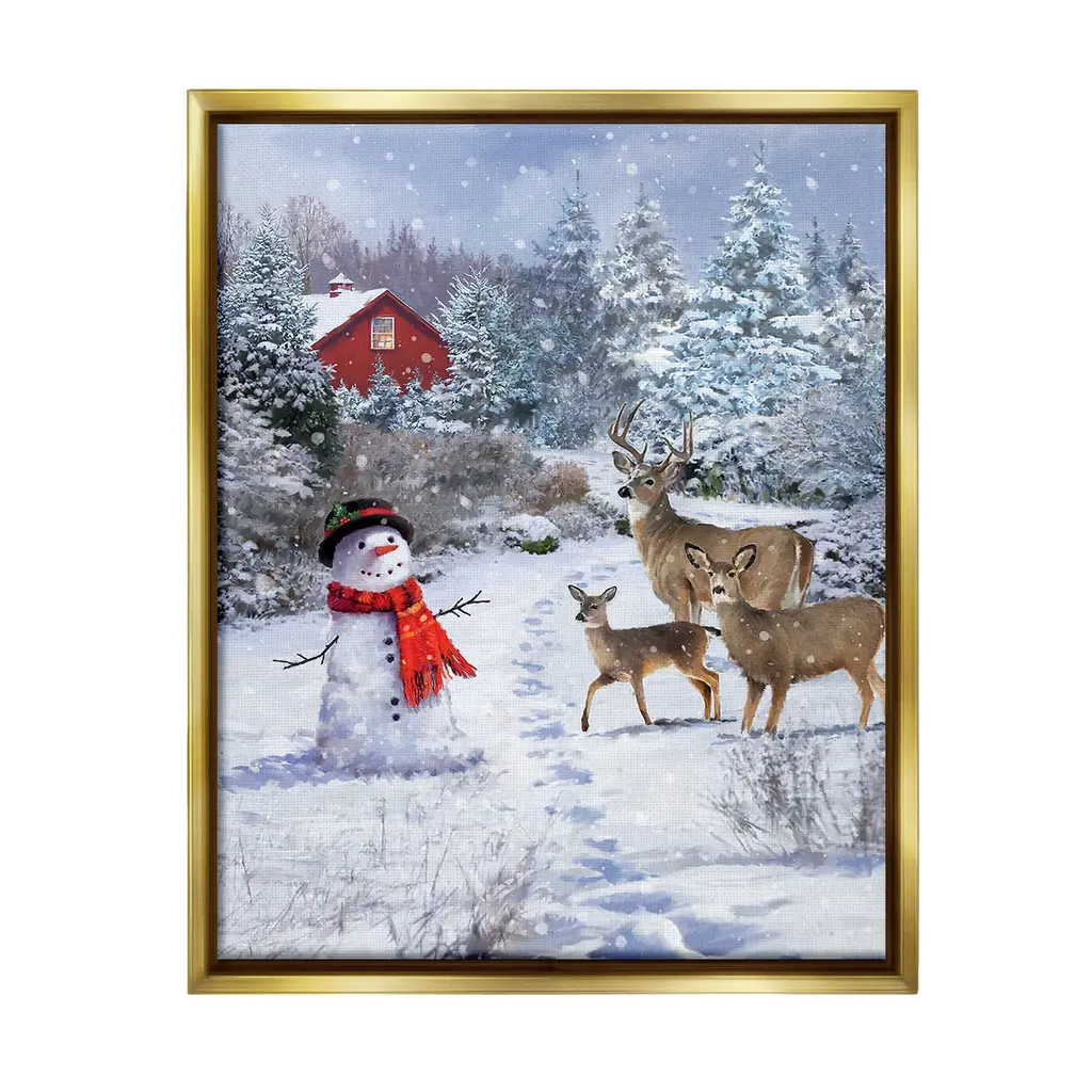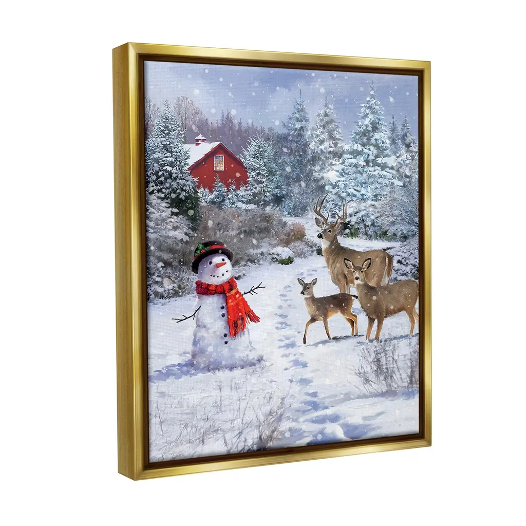Stupell Reindeer & Snowman Landscape Framed Floater Canvas Wall Art Design By Jason Kirk - 17 X 21 - Gold