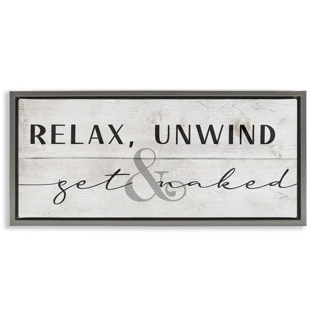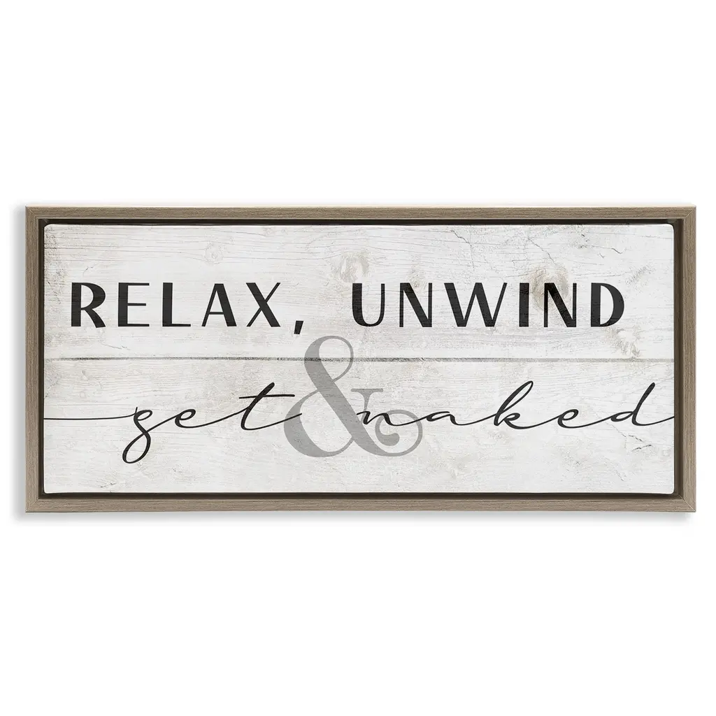 Elevate your home or office to the next level with Stupell Framed Floating Canvas Wall Art. Our premium hand-stretched canvas is mounted securely into a sturdy lightweight frame. The museum-style gap between the wrapped canvas and the box frame gives the illusion of floating artwork. Stupell Wall Art is made in the USA.Features: Dimensions: 25 x 1.7 x 11 Frame, 24 x 1.5 x 10 Canvas ArtFloating Frame Canvas Products are available in sizes 25"x11" and 31"x14". All Floating Frame Canvas Products have a 1.7" Depth.Wall Art is Ready to Hang with Hardware Free Hanging. No Installation required. For Easy Set Up Lean or Layer Artwork on Shelf or Against Wall. Artwork is Permently Fixed into the Frame.Our elevated 1.7" Thick Floating Frame is the perfect complement to our canvas style Wall Art. We use only the highest quality inks in house with industry leading printing solutions. Canvas is hand stretched over a durable wood foundation and then mounted securly into a Modern Box Frame. Made in the USA.Artwork Relates To: Bathroom, Humor, Phrase, Get Naked, Relax, Bath, FunnyDesign by Daphne Polselli