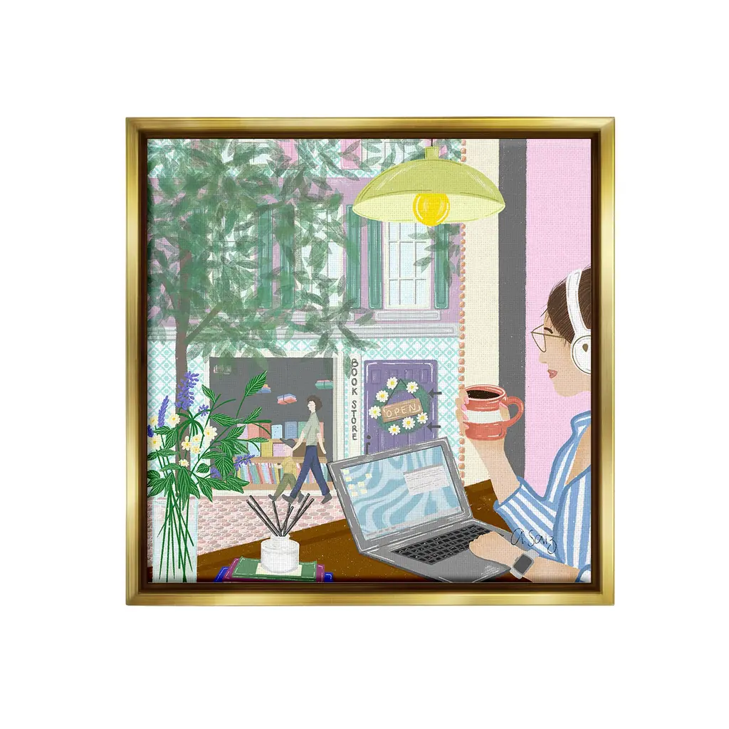 Add dimension to any room with our textured Framed Giclee Artwork. Our framed artwork is securely mounted into a 1.5-inch thick wood grain frame and ready to hang. Frames are available in three alluring styles: black, gray farmhouse and white. In addition, you should check out our oversized options if you want a statement piece. Stupell Wall Art is made in the USA.Features: Dimensions: 12 x 1.5 x 12 FramedFramed Giclee Product Sizes Include 12"x12", 17"x17", and 24"x24". Framed Giclee Products have a 1.5" Depth. Wall Art is Ready to Hang with Hardware Free Hanging. No installation required. For Easy Set Up Lean or Layer Artwork on Shelf or Against Wall.Our giclée prints are carefully mounted on a durable MDF backing, and then perfectly finished in a 1.5 inch thick woodgrain frame. Mounted frame colors include black, gray farmhouse and white. Made In USA.Artwork Relates To: Computer, Cup, Laptop, Female, Person, Woman, Mug, Coffee, Cafe, Headphones, City, Street, Town, Botanical, PlantDesign by Ale Saiz Studio