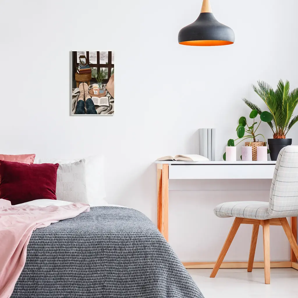 Our wall plaques start as high-quality lithograph prints mounted on durable 0.5-inch thick MDF wood. Each piece is hand finished and comes with a fresh layer of white foil on the sides to give it a crisp, clean look. Plaques arrive ready to hang without installation and come with removable plastic corners to keep them from damage in transit. Wall Art is made in the USA.Features: Dimensions: 10 x 0.5 x 15 InchesWall Plaque Sizes Include Standard: 10 x 0.5 x 15 Oversized: 13 x 0.5 x 19Wall Art is Ready to Hang with Hardware Free Hanging. No installation required. For Easy Set Up Lean or Layer Artwork on Shelf or Against Wall.All of our wall plaques start off as high quality lithograph prints that are then mounted on durable 0.5 inch thick MDF wood. Each piece is hand finished and comes with a fresh layer of foil on the sides to give it a crisp clean look. Made In USA.Artwork Relates To: Female, Person, Woman, Indoors, Room, Book, Reading, CandlesDesign by Saba Rauf