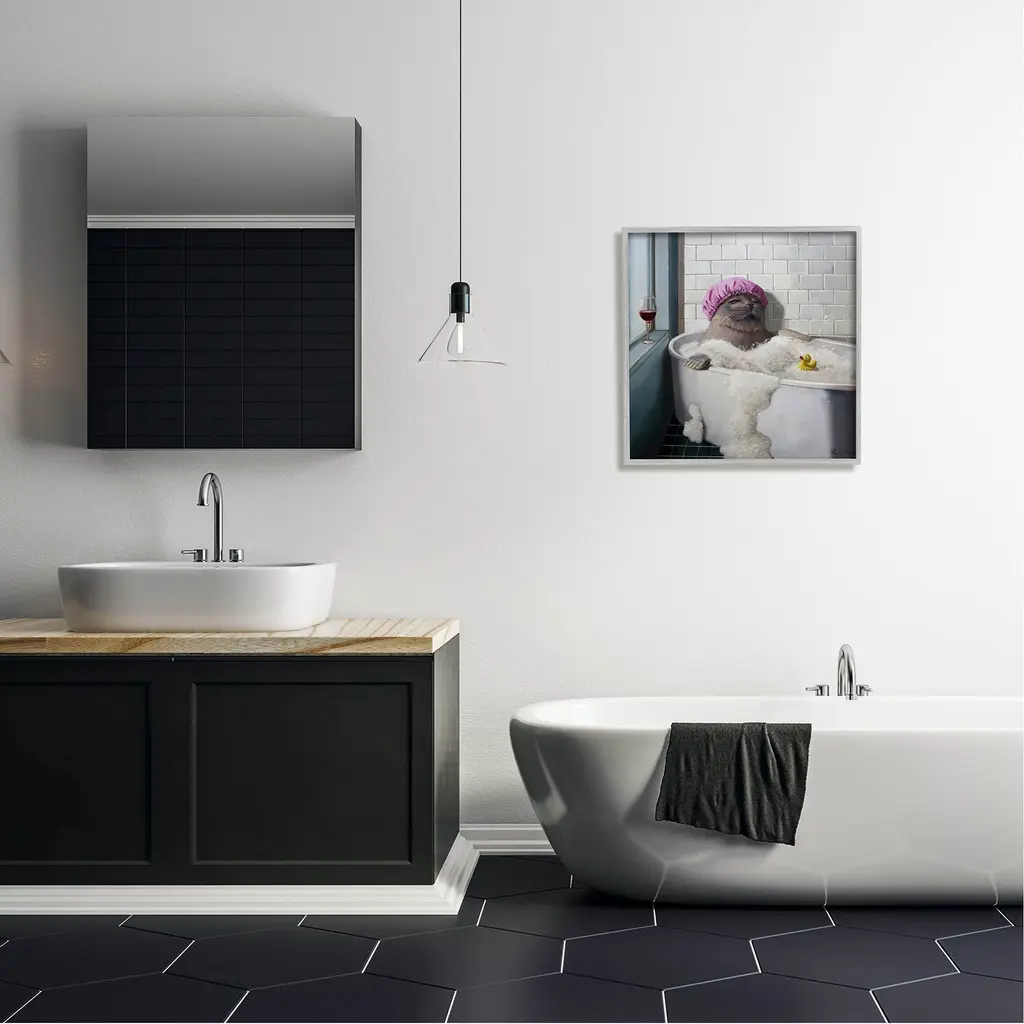 Our Framed Giclee Wall Art adds a touch of class to any space in your home or office. Frames are available in three alluring styles: black, gray farmhouse and white. Our textured artwork will add more depth and dimension to any space. Each piece is mounted with a 1.5 inch thick wood grain frame that is ready to hang! Looking for a statement piece? We have oversized artwork available.Features: Dimensions: 12 x 1.5 x 12 FramedFramed Giclee Sizes Include Standard: 12 x 1.5 x 12 Large: 17 x 1.5 x 17 Oversized: 24 x 1.5 x 24Wall Art is Ready to Hang - No Installation or Hardware Needed. For Easy Set Up Lean or Layer Artwork on Shelf or Against Wall.Our giclée prints are carefully mounted on a durable MDF backing, and then perfectly finished in a 1.5 inch thick woodgrain frame. Mounted frame colors include black, gray farmhouse and white. Made In USA.Artwork Relates To: Bathing, Bathtub, Tub, Cat, Mammal, Animal, Seal, Sea Lion, Rubber Duck, Wine Glass, BathroomDesign by Lucia Heffernan