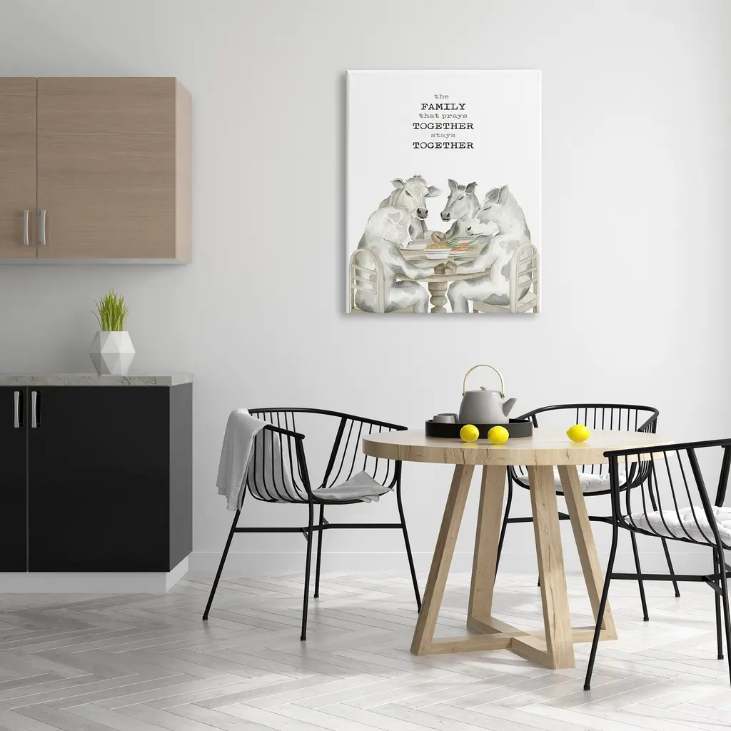 We create our stretched canvas to the highest standards. Using only the highest quality inks and canvas on Mimaki printers, we hand-cut and stretch each piece over a 1.5-inch thick wooden frame for hanging. As a result, the art comes ready to hang on the sturdy ledge with no installation required. Stupell Wall Art is made in the USA.Features: Dimensions: 16 x 1.5 x 20 InchesStretched Canvas Sizes Include Standard: 16 x 1.5 x 20 Large: 20 x 1.5 x 30 X-Large: 30 x 1.5 x 40 Oversized: 36 x 1.5 x 48Wall Art is Ready to Hang with Hardware Free Hanging. No installation required. For Easy Set Up Lean or Layer Artwork on Shelf or Against Wall.Our stretched canvas is created with the highest standards. We use only the highest quality inks and canvas on our in house Mimaki printers, and then hand cut and stretch each piece over a 1.5 inch thick wooden frame for hanging. Made In USA.Artwork Relates To: Kitchen, Table, Animal, Cattle, Mammal, Cow, Spiritual, Religious, The Family That Prays Together Stays TogetherDesign by Cindy Jacobs