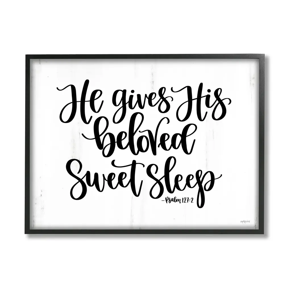 It is time to set up your room with of our fresh new 'Framed Giclee Textured Wall Art' pieces. You may have seen our Wooden or Canvas products, but our framed products are now available in three alluring styles: black, gray farmhouse and white. Our textured artwork will add more depth and dimension to any space. Each piece is mounted with a 1.5 inch thick wood grain frame that is ready to hang! Looking for a statement piece? We have oversized artwork available.Features: Wall Art is Ready to Hang - No Installation or Hardware Needed. For Easy Set Up Lean or Layer Artwork on Shelf or Against Wall.Our giclee prints are carefully mounted on a durable MDF backing, and then perfectly finished in a 1.5 inch thick woodgrain frame. Frame colors include black, gray farmhouse and white. Made In USA.Artwork Relates To: Calligraphy; He gives His beloved Sweet sleep; PsalmDesign by Imperfect Dust