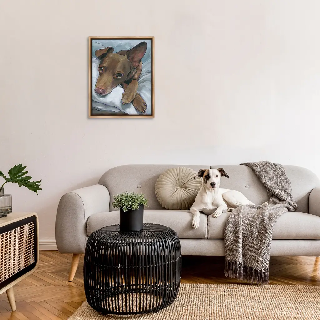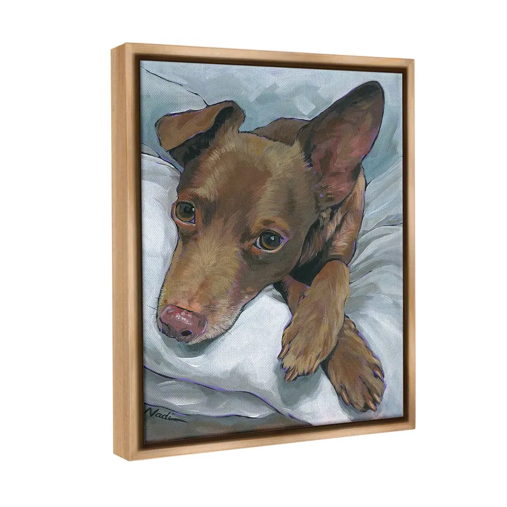 Elevate your home or office to the next level with Stupell Framed Floating Canvas Wall Art. Our premium hand-stretched canvas is mounted securely into a sturdy lightweight frame. The museum-style gap between the wrapped canvas and the box frame gives the illusion of floating artwork. Stupell Wall Art is made in the USA.Features: Dimensions: 17 x 1.7 x 21 Frame, 16 x 1.5 x 20 Canvas ArtFloating Frame Canvas Products are available in sizes 17"x21" and 25"x31". All Floating Frame Canvas Products have a 1.7" Depth.Wall Art is Ready to Hang with Hardware Free Hanging. No Installation required. For Easy Set Up Lean or Layer Artwork on Shelf or Against Wall. Artwork is Permently Fixed into the Frame.Our elevated 1.7" Thick Floating Frame is the perfect complement to our canvas style Wall Art. We use only the highest quality inks in house with industry leading printing solutions. Canvas is hand stretched over a durable wood foundation and then mounted securly into a Modern Box Frame. Made in the USA.Artwork Relates To: Painting, Animal, Canine, Dog, Mammal, Pet, Sleeping, Cuddle, RestDesign by Nadi Spencer
