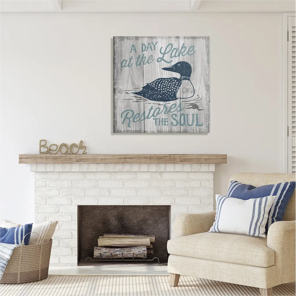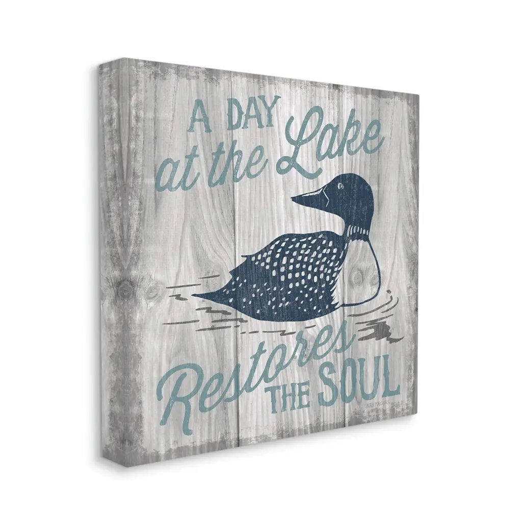 We create our stretched canvas to the highest standards. Using only the highest quality inks and canvas on Mimaki printers, we hand-cut and stretch each piece over a 1.5-inch thick wooden frame for hanging. As a result, the art comes ready to hang on the sturdy ledge with no installation required. Stupell Wall Art is made in the USA.Features: Dimensions: 17 x 1.5 x 17 InchesStretched Canvas Sizes Include Standard: 17 x 1.5 x 17 Large: 24 x 1.5 x 24 X-Large: 30 x 1.5 x 30 Oversized: 36 x 1.5 x 36Wall Art is Ready to Hang with Hardware Free Hanging. No installation required. For Easy Set Up Lean or Layer Artwork on Shelf or Against Wall.Our stretched canvas is created with the highest standards. We use only the highest quality inks and canvas on our in house Mimaki printers, and then hand cut and stretch each piece over a 1.5 inch thick wooden frame for hanging. Made In USA.Artwork Relates To: Duck, Lake, Rustic, A Day at the Lake Restores the SoulDesign by Laura Marshall
