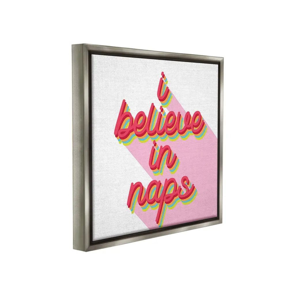 Elevate your home or office to the next level with Stupell Framed Floating Canvas Wall Art. Our premium hand-stretched canvas is mounted securely into a sturdy lightweight frame. The museum-style gap between the wrapped canvas and the box frame gives the illusion of floating artwork. Stupell Wall Art is made in the USA.Features: Dimensions: 18 x 1.7 x 18 Frame, 17 x 1.5 x 17 Canvas ArtFloating Frame Canvas Products are available in sizes 18"x18" and 25"x25". All Floating Frame Canvas Products have a 1.7" Depth.Wall Art is Ready to Hang with Hardware Free Hanging. No Installation required. For Easy Set Up Lean or Layer Artwork on Shelf or Against Wall. Artwork is Permently Fixed into the Frame.Our elevated 1.7" Thick Floating Frame is the perfect complement to our canvas style Wall Art. We use only the highest quality inks in house with industry leading printing solutions. Canvas is hand stretched over a durable wood foundation and then mounted securly into a Modern Box Frame. Made in the USA.Artwork Relates To: Phrase, Humor, Funny, Retro, Pattern, Typography, I Believe in NapsDesign by Lil' Rue
