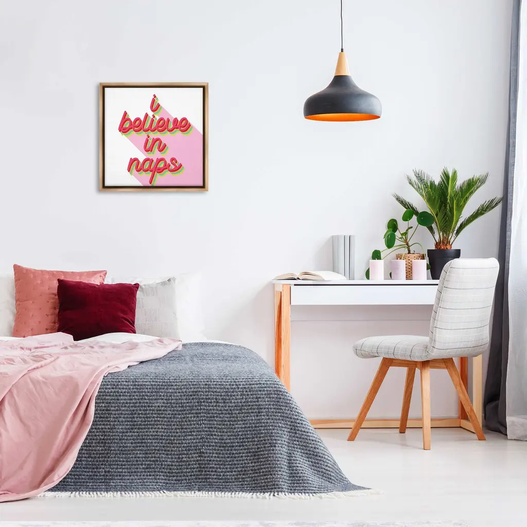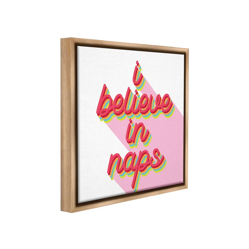 Elevate your home or office to the next level with Stupell Framed Floating Canvas Wall Art. Our premium hand-stretched canvas is mounted securely into a sturdy lightweight frame. The museum-style gap between the wrapped canvas and the box frame gives the illusion of floating artwork. Stupell Wall Art is made in the USA.Features: Dimensions: 18 x 1.7 x 18 Frame, 17 x 1.5 x 17 Canvas ArtFloating Frame Canvas Products are available in sizes 18"x18" and 25"x25". All Floating Frame Canvas Products have a 1.7" Depth.Wall Art is Ready to Hang with Hardware Free Hanging. No Installation required. For Easy Set Up Lean or Layer Artwork on Shelf or Against Wall. Artwork is Permently Fixed into the Frame.Our elevated 1.7" Thick Floating Frame is the perfect complement to our canvas style Wall Art. We use only the highest quality inks in house with industry leading printing solutions. Canvas is hand stretched over a durable wood foundation and then mounted securly into a Modern Box Frame. Made in the USA.Artwork Relates To: Phrase, Humor, Funny, Retro, Pattern, Typography, I Believe in NapsDesign by Lil' Rue