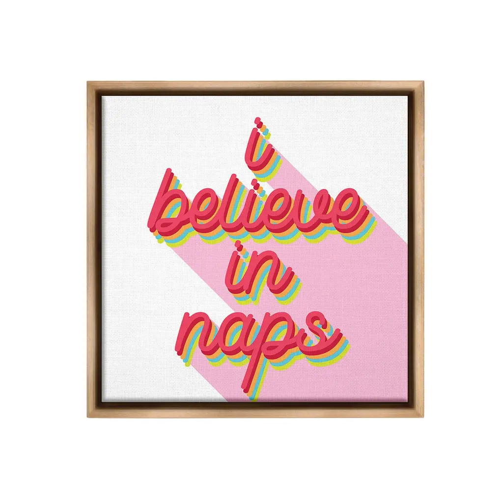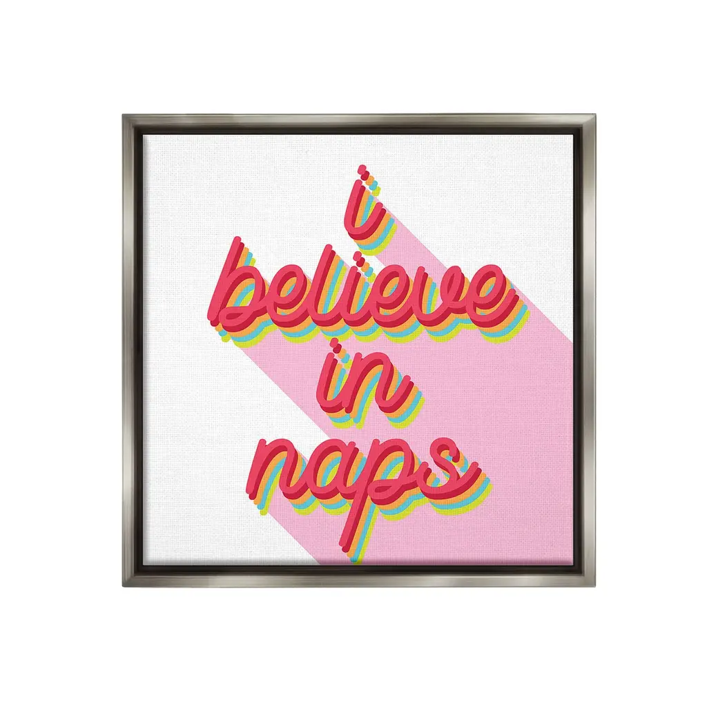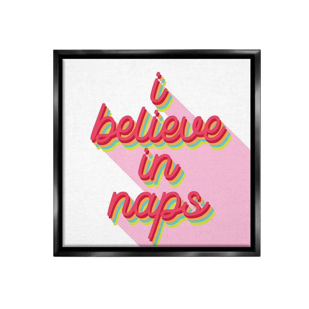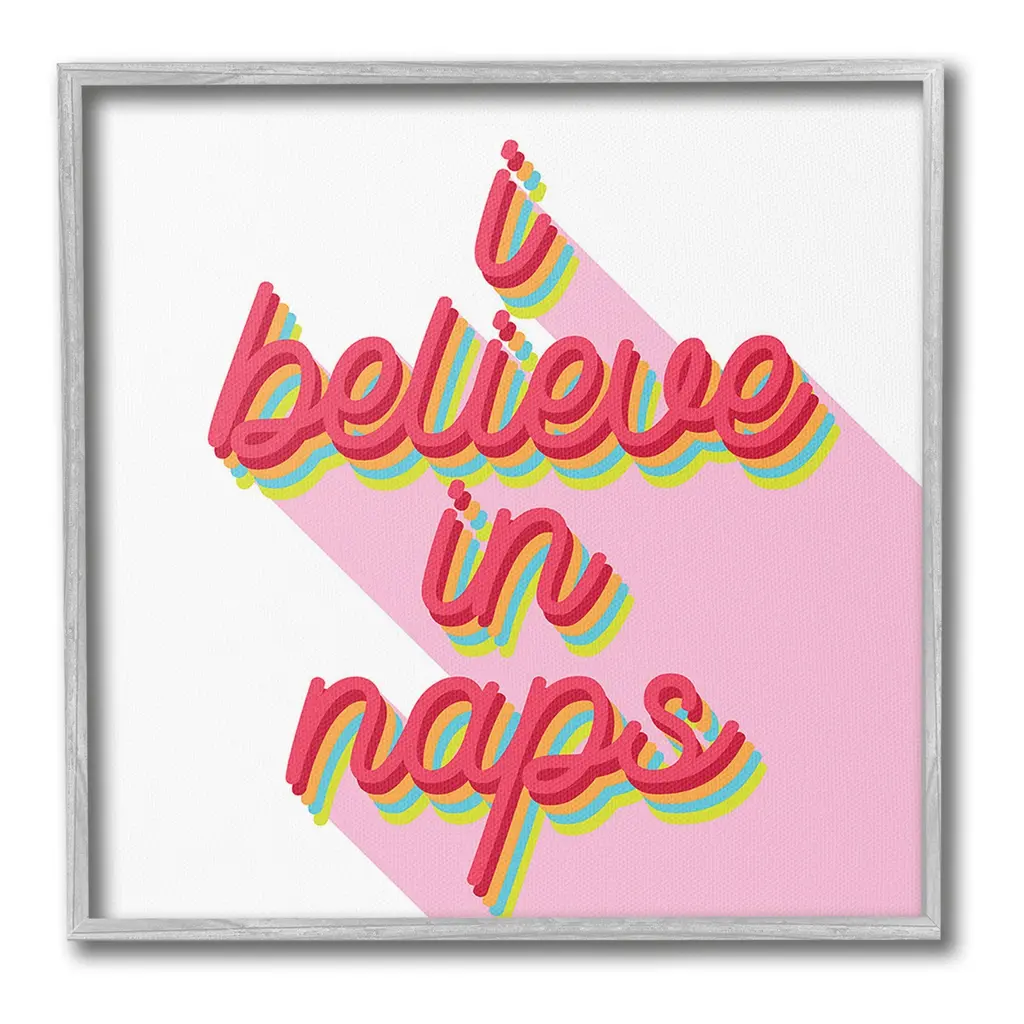 Add dimension to any room with our textured Framed Giclee Artwork. Our framed artwork is securely mounted into a 1.5-inch thick wood grain frame and ready to hang. Frames are available in three alluring styles: black, gray farmhouse and white. In addition, you should check out our oversized options if you want a statement piece. Stupell Wall Art is made in the USA.Features: Dimensions: 12 x 1.5 x 12 FramedFramed Giclee Product Sizes Include 12"x12", 17"x17", and 24"x24". Framed Giclee Products have a 1.5" Depth. Wall Art is Ready to Hang with Hardware Free Hanging. No installation required. For Easy Set Up Lean or Layer Artwork on Shelf or Against Wall.Our giclée prints are carefully mounted on a durable MDF backing, and then perfectly finished in a 1.5 inch thick woodgrain frame. Mounted frame colors include black, gray farmhouse and white. Made In USA.Artwork Relates To: Phrase, Humor, Funny, Retro, Pattern, Typography, I Believe in NapsDesign by Lil' Rue
